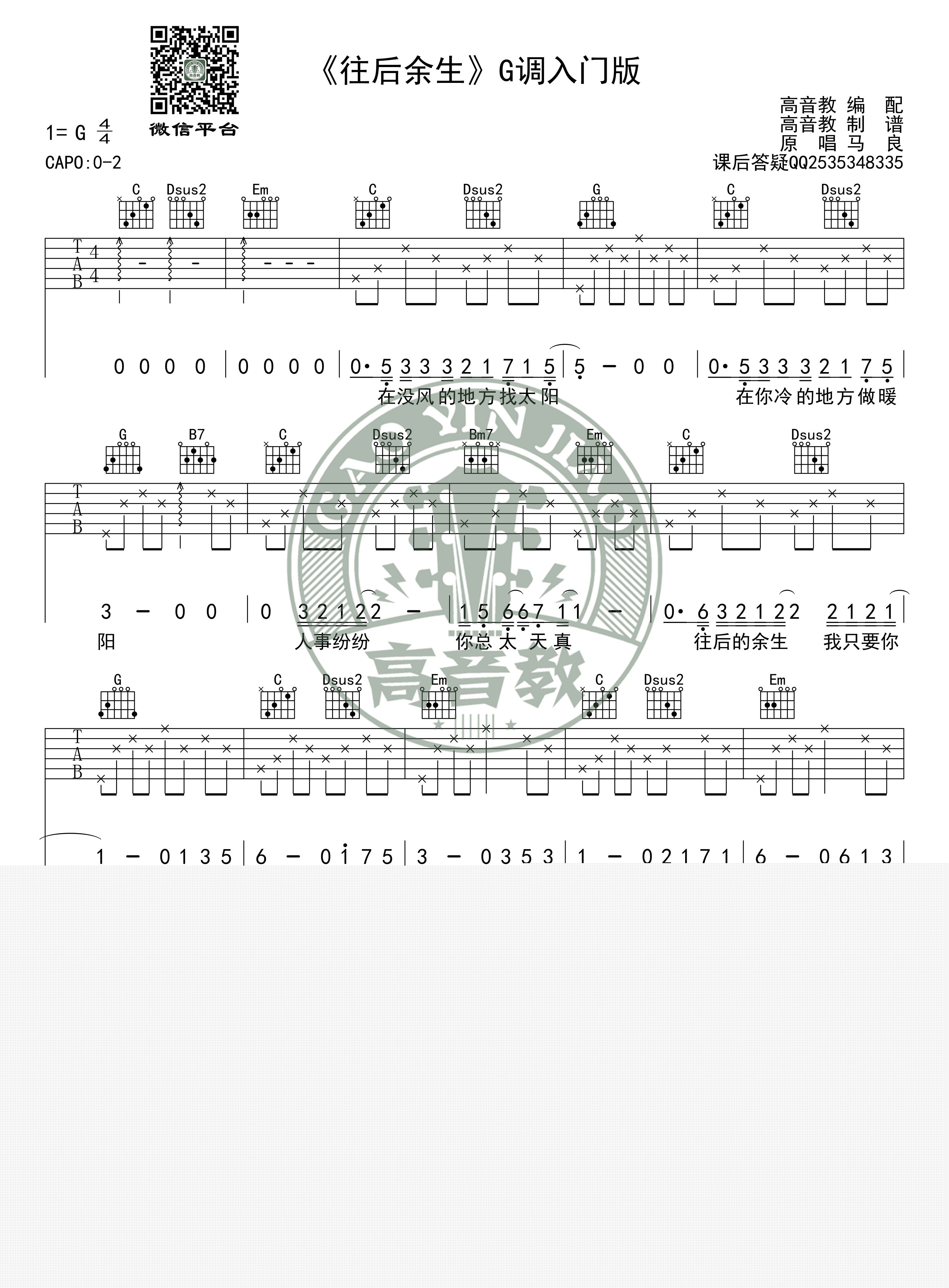 曲谱介绍: 马良《往后余生入门版》吉他弹唱谱,采用G调指法编配,共有2张高清图谱,免翻页排版设计。