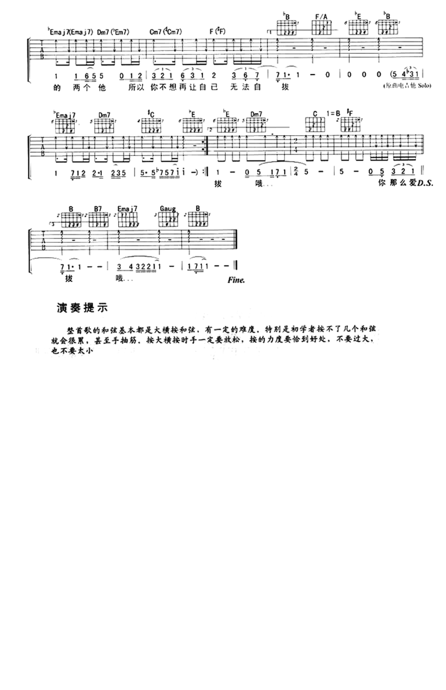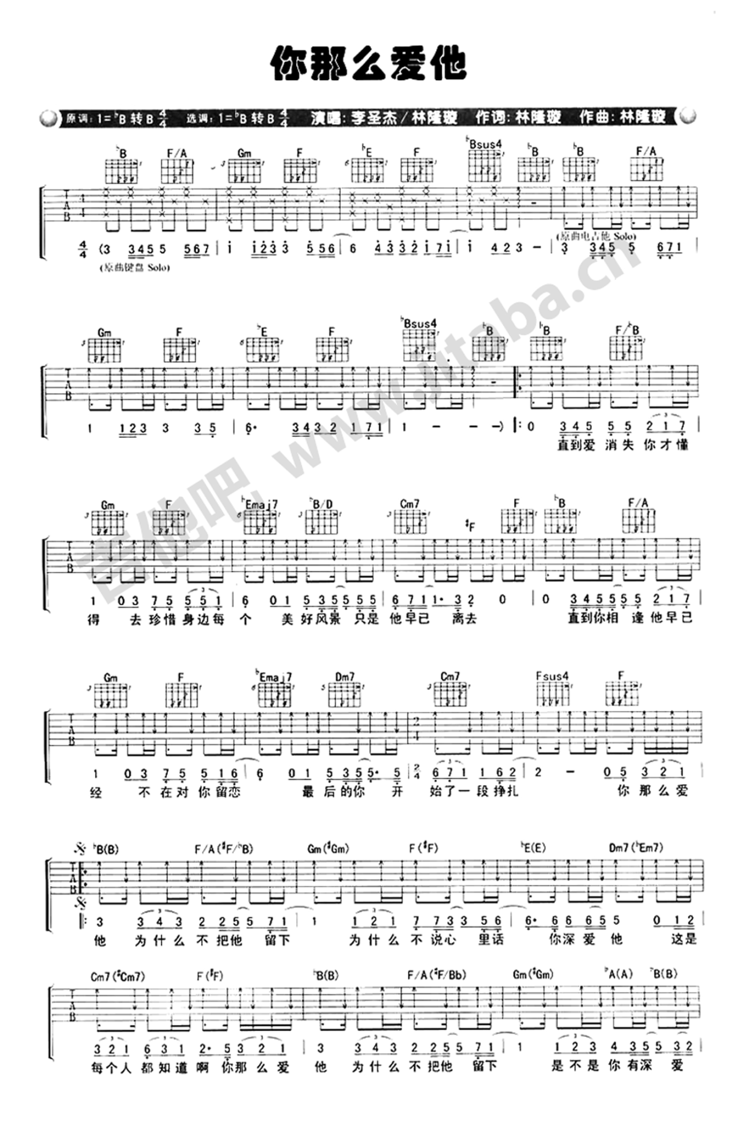 曲谱介绍: 你那么爱他吉他谱-李圣杰吉他弹唱谱你你们爱他是李圣杰/林隆璇的合唱,收录在关于你的歌专辑。本谱选用bB转B调,您可以参考本页吉他和弦示意图和扫弦指法进行吉他弹奏。歌曲基本上都是大横按和弦,初学者要适当放松,力度掌握好,以免手累。你那么爱他歌词直到爱消失你才懂得,去珍惜身边每个,美好风景,只是她早已离去,直到你想通她早已经,不再对你留恋,最后的你开始了一段挣扎,你那么爱她为甚么不把她留下,为甚么不说心里话,你深爱她这是每个人都知道啊,你那么爱他为甚么不把她留下,是不是你有深爱的两个她,所以你不想再让自己无法自拔。