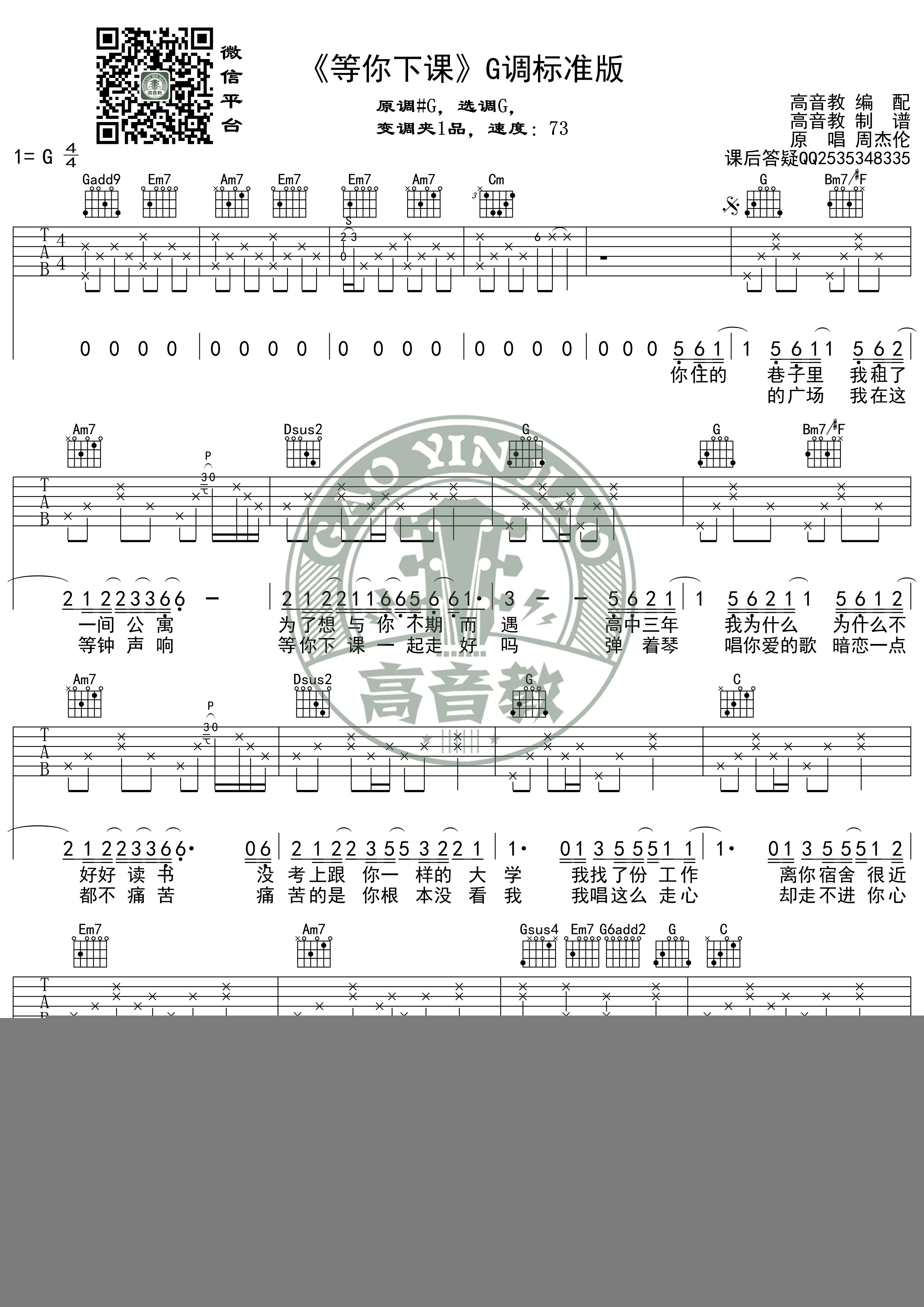 等你下课 标准版吉他谱 - 周杰伦 - G调吉他弹唱谱