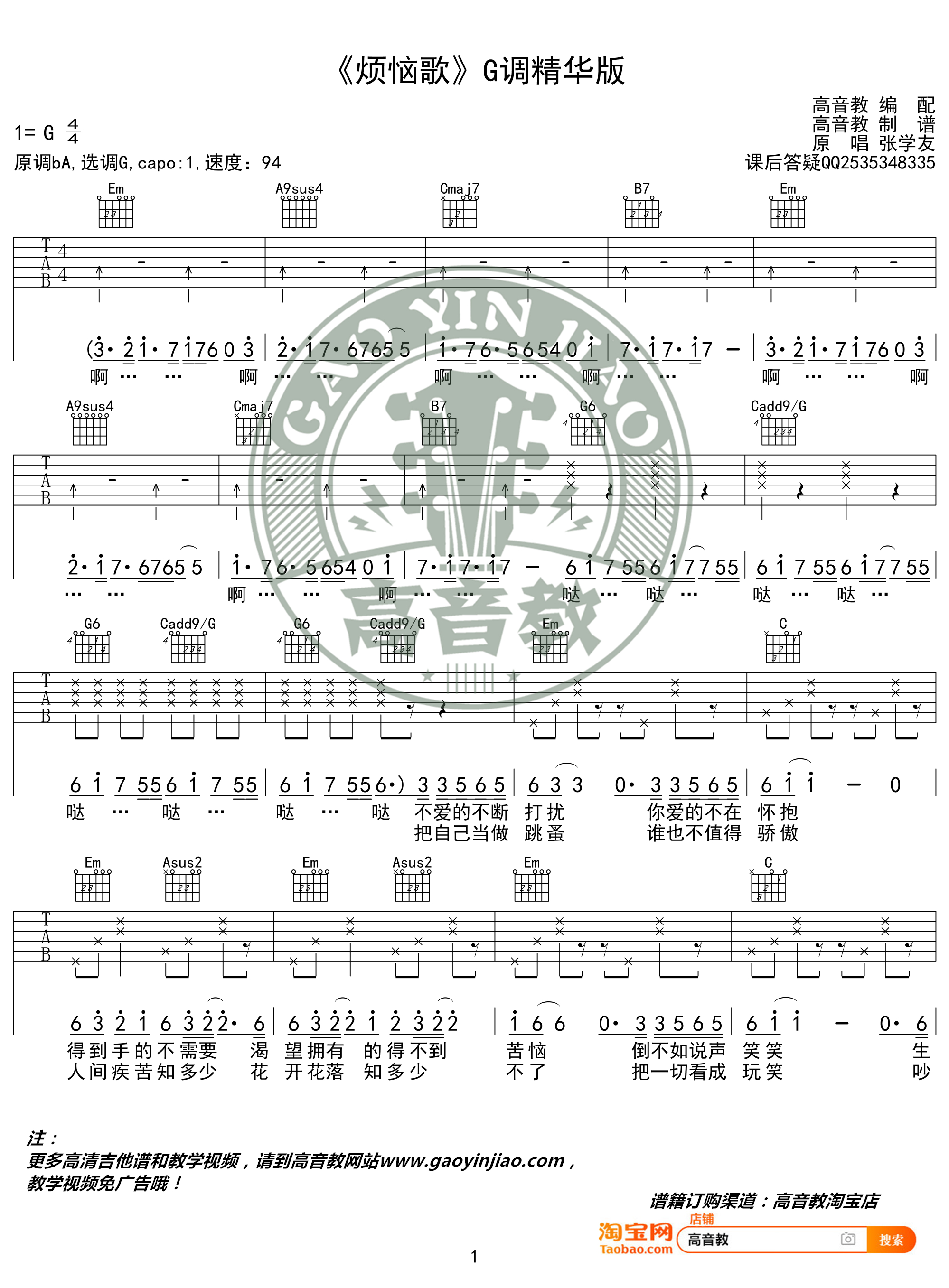 曲谱介绍: 张学友《烦恼歌》吉他弹唱谱,采用G调指法编配,共有3张高清图谱。