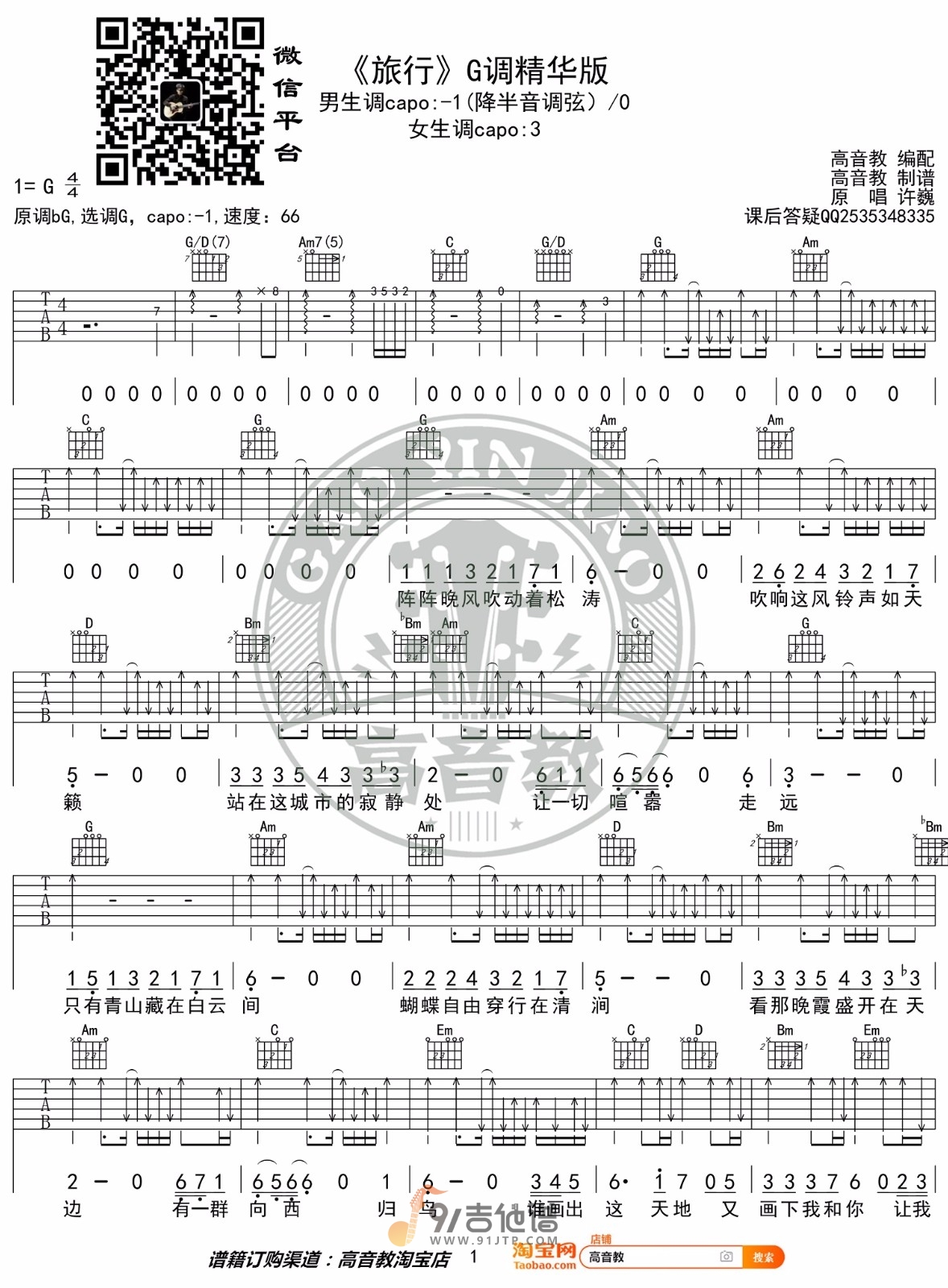曲谱介绍: 曲谱简介:旅行吉他谱,许巍演唱的一首歌曲,4/4拍的节奏,这首歌曲的原调为#F调,这里曲谱采用了G调指法进行编配,演唱时降半音调弦可回到原调,也可根据个人实际嗓音情况选择不降音或夹几品。曲谱由高音教编配出品。这首歌是为了纪念2004年因车祸逝世的朋友而制作,想起这位逝去的老朋友生前最喜欢的事情就是去旅行,经过半年多的斟酌,最终为这首歌定名,可以说这也是许巍的自白书。
