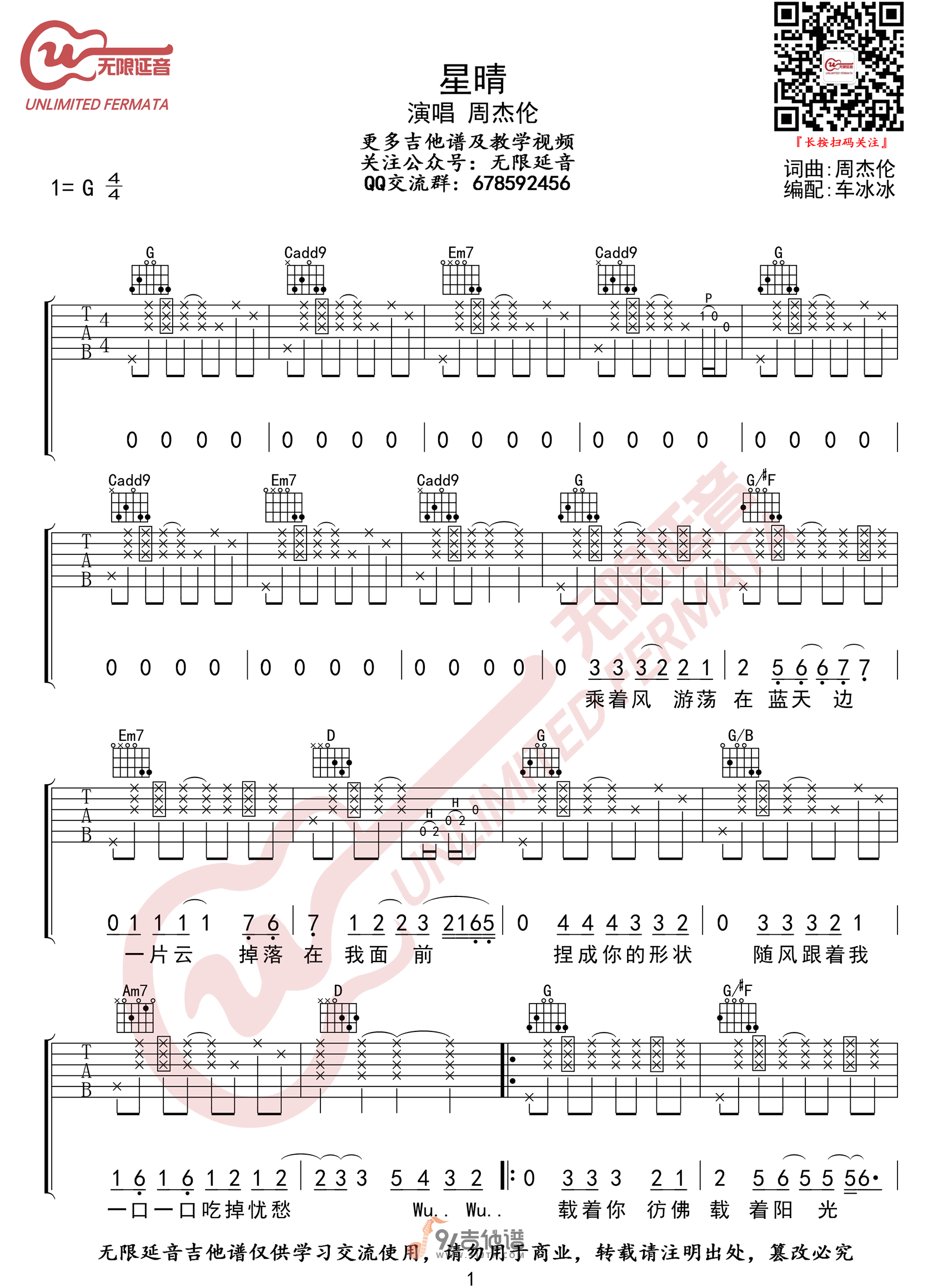 曲谱介绍: 曲谱简介:星晴吉他谱,周杰伦演唱的一首歌曲,4/4拍的节奏,这首歌曲的原调为G调,这里曲谱采用了G调指法进行编配,演唱时可不夹变调夹,曲谱由无限延音编配出品。这首歌是周杰伦的第一张同名专辑《Jay》里面的歌曲,一首旋律轻快歌词朗朗上口的歌曲。