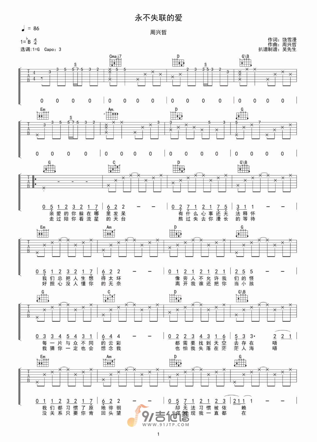 曲谱介绍: 曲谱简介:永不失联的爱吉他谱,周兴哲演唱的一首歌曲,4/4拍的节奏,这首歌曲的原调为降B调,这里曲谱采用了G调指法进行编配,演唱时夹变调夹3品可回到原调,也可根据个人实际嗓音情况选择。曲谱由吴先生TAB编配出品。这首歌曾经作为了戏剧《小妖的金色城堡》的主题曲,而其中的歌词,由著名作家饶雪漫填词。