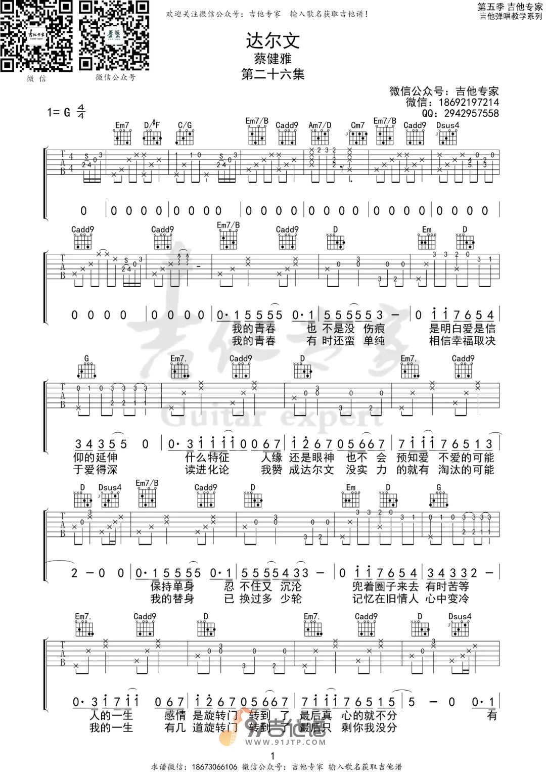 曲谱介绍: 曲谱简介:达尔文吉他谱,蔡健雅演唱的一首歌曲,4/4拍的节奏,这首歌曲的原调为G调,这里曲谱采用了G调指法进行编配,演唱时可不夹变调夹,曲谱由吉他专家编配出品。歌曲透过吉他清弦撩拨,蔡健雅的歌声诠释,唱尽了所有徘徊爱情旋转门的男女感情动物们的心路历程。