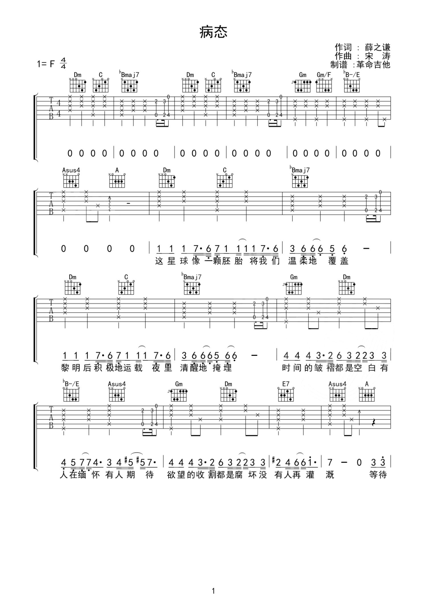 病态吉他谱 - 薛之谦 - F调吉他弹唱谱