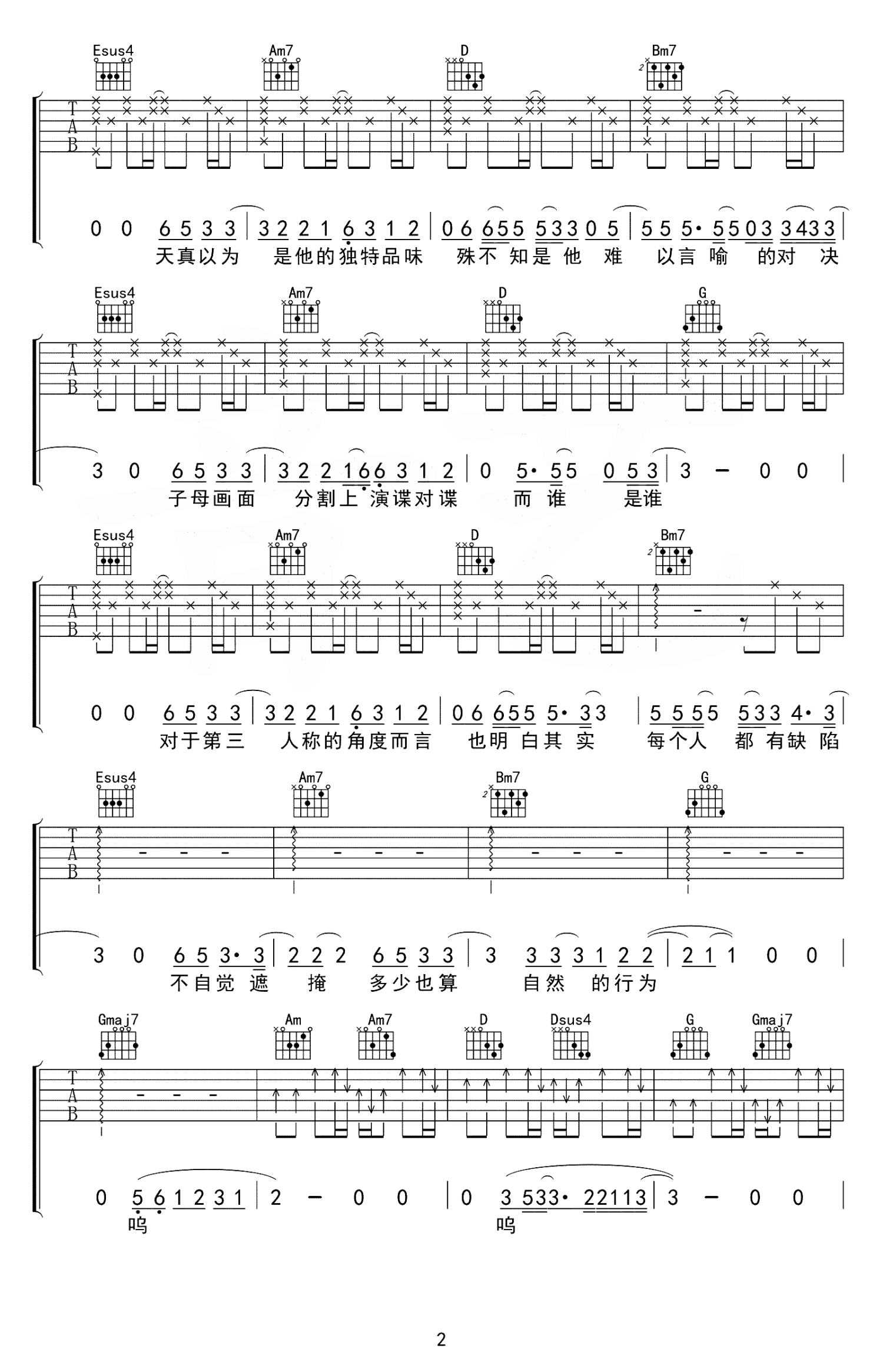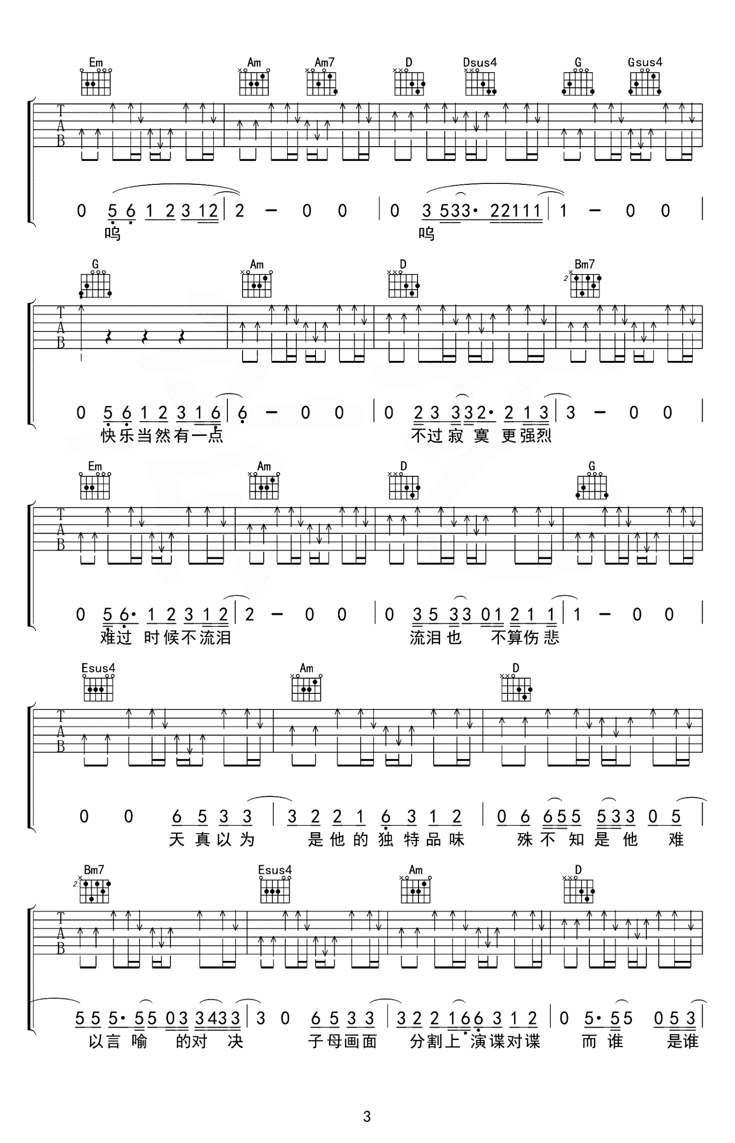 曲谱介绍: 一首关于流浪者的歌曲,台湾歌手HUSH是非常有特质的音乐人,创作了许多诚恳的向听者和自我提问,并思考不同人生意义的歌。这首《第三人称》伴奏很随意,琴友们在弹奏时不需要按照谱子来,右手的节奏型可根据各自习惯和感觉来,只要拍子没有错就好!
