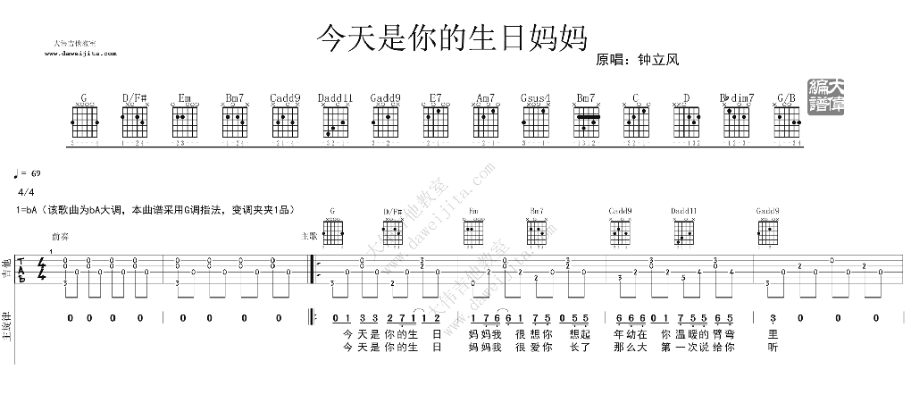曲谱介绍: 李健《今天是你的生日妈妈》吉他弹唱谱,采用A调指法编配,共有5张高清图谱。