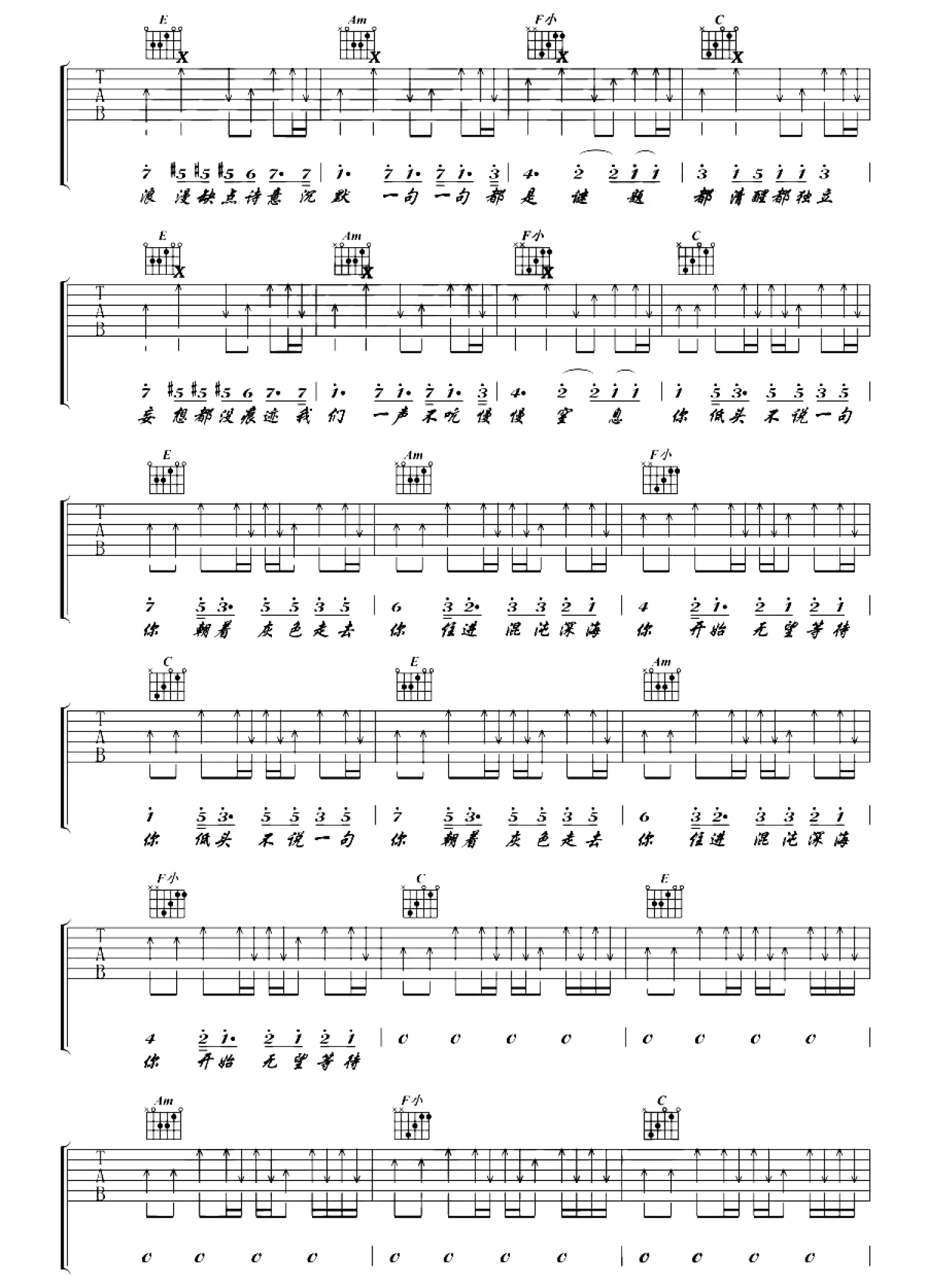 曲谱介绍: 陈粒光吉他谱,原调D变调夹夹二品C调指法,光吉他六线谱,完整版共五张图片谱子,分两页展示。陈粒的歌声总是容易让人掉入其营造氛围里,旋律优美,音色纯净,淡淡的忧伤中蕴含一股坚强的力量。弹奏的时候注意放慢速度稳定右手节奏,演唱时把情感融入其中才能更好的表现。