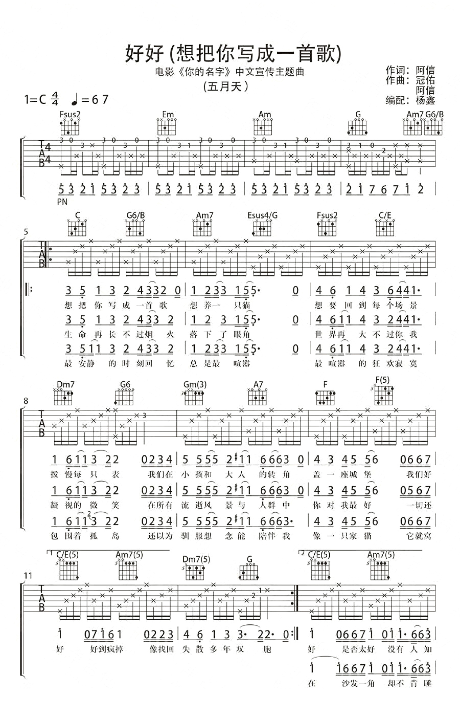 曲谱介绍: 五月天演唱,好好(想把你写成一首歌)吉他谱,C调弹唱谱。电影《你的名字》中文宣传主题曲。“想把你写成一首歌想养一只猫”这一句唱出瞬间好温暖,想起了一切美好的时刻。后面的“好好的生活,好好的变老,好好的假装我已把你忘掉”又直接忍不住泪奔,我们都忘了时间有脚,那日子会是那么短。时间它带走的是什么,大家心里都会懂。我想我们有一天回想往事,想到的都是美好的,就是好好。