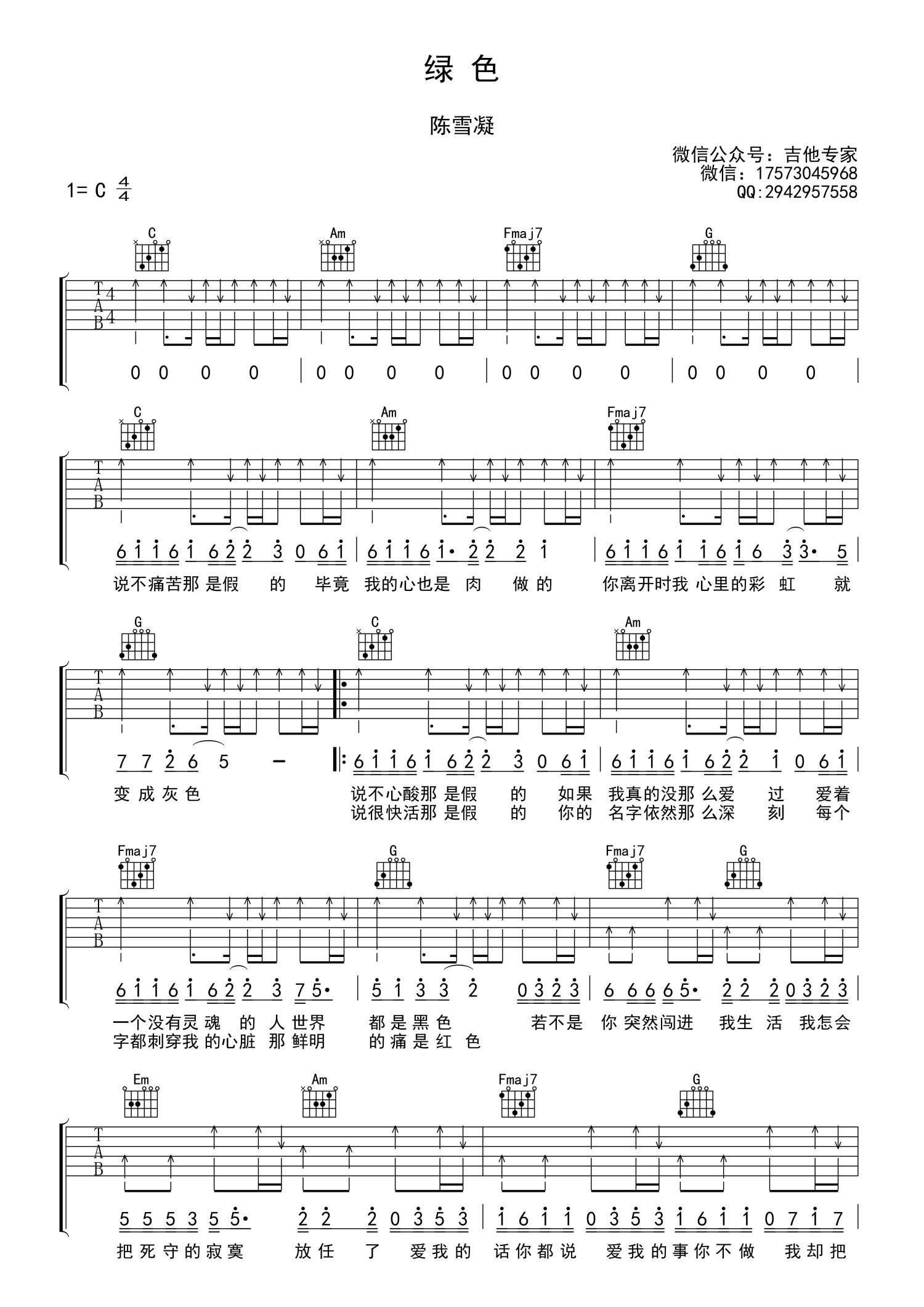 • 绿色吉他谱 - 陈雪凝 - C调吉他弹唱谱第1张