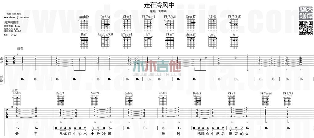 曲谱介绍: 刘思涵《走在冷风中》吉他弹唱谱,采用A调指法编配,共有5张高清图谱。
