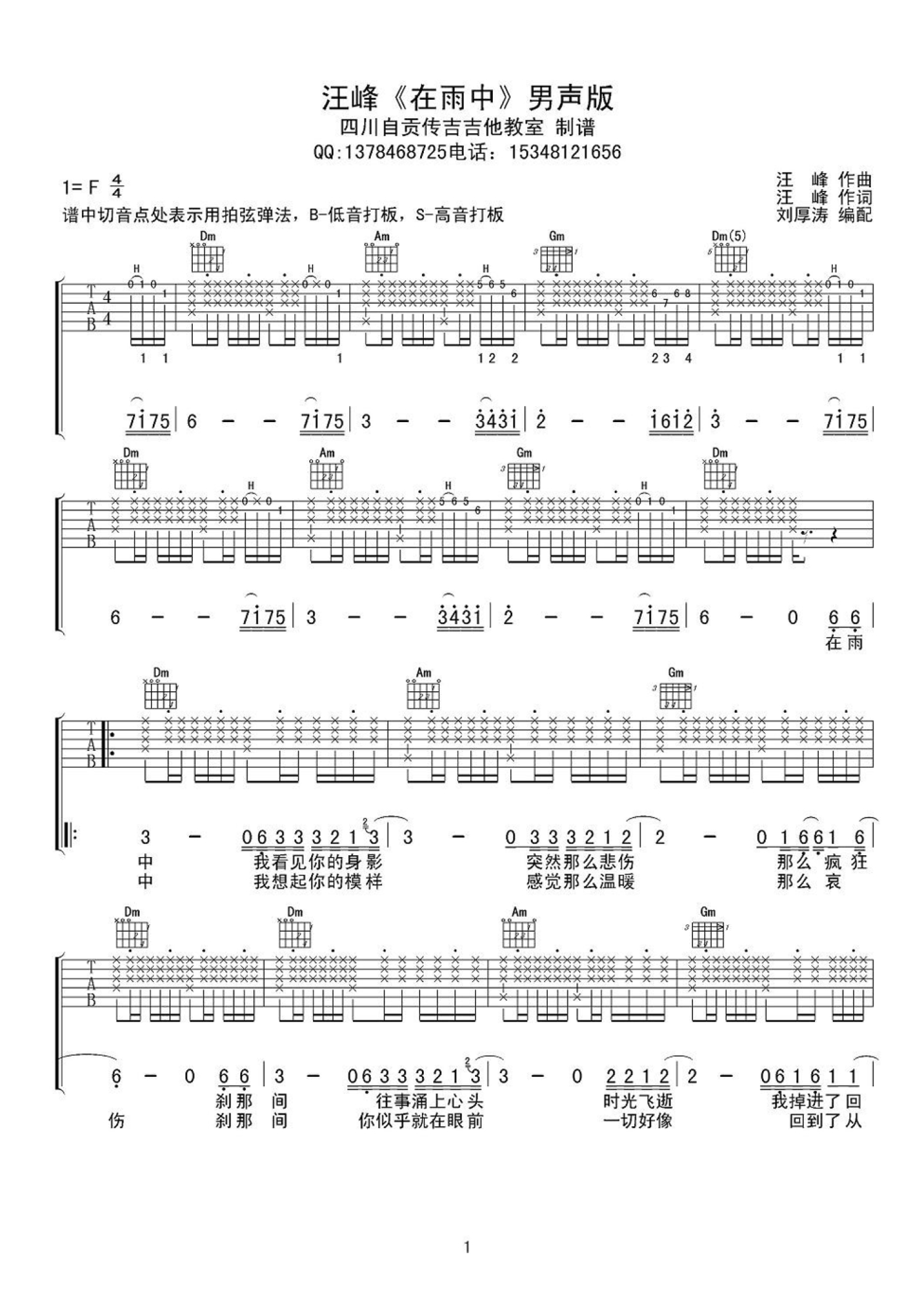 曲谱介绍: 汪峰 在雨中吉他谱 男声版
