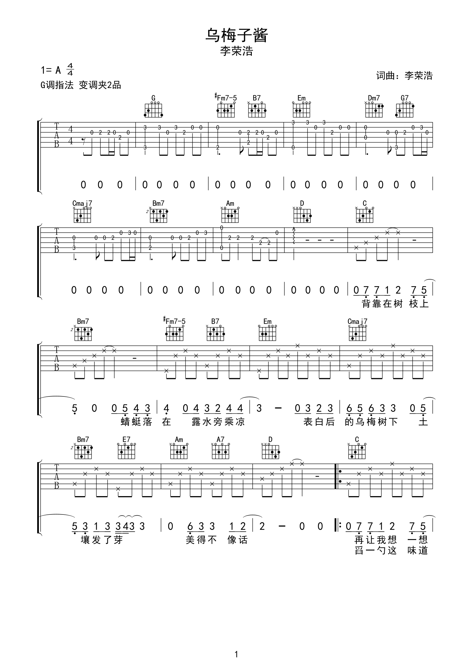 曲谱介绍: 吉他谱介绍:乌梅子酱吉他谱,李荣浩演唱的一首歌曲,4/4拍的节奏,这首歌曲的原调为A调,这里曲谱采用了G调指法进行编配,演唱时夹变调夹2品可回到原调,也可根据个人实际嗓音情况选择。曲谱由琴谱网更新上传,共3张高清图片弹唱吉他谱例,曲谱来源于网络转载,编配制谱者暂不详。“你浅浅的微笑就像乌梅子酱,我尝了你嘴角唇膏薄荷味道,是甜甜的爱情,来的这么确定,因为你每个害羞的反应。”