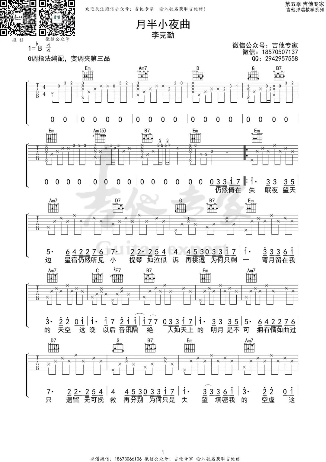 曲谱介绍: 吉他谱介绍:月半小夜曲吉他谱,李克勤演唱的一首歌曲,4/4拍的节奏,这首歌曲的原调为降B调,这里曲谱采用了G调指法进行编配,演唱时夹变调夹3品可回到原调,也可根据个人实际嗓音情况选择。曲谱由琴谱网更新上传,共3张高清图片弹唱吉他谱例,来源于@吉他专家编配出品。这首歌有着凄楚动人的曲调、跌宕起伏的旋律以及直抵人心的歌词,李克勤演唱的该曲道出了一个令人动容的故事