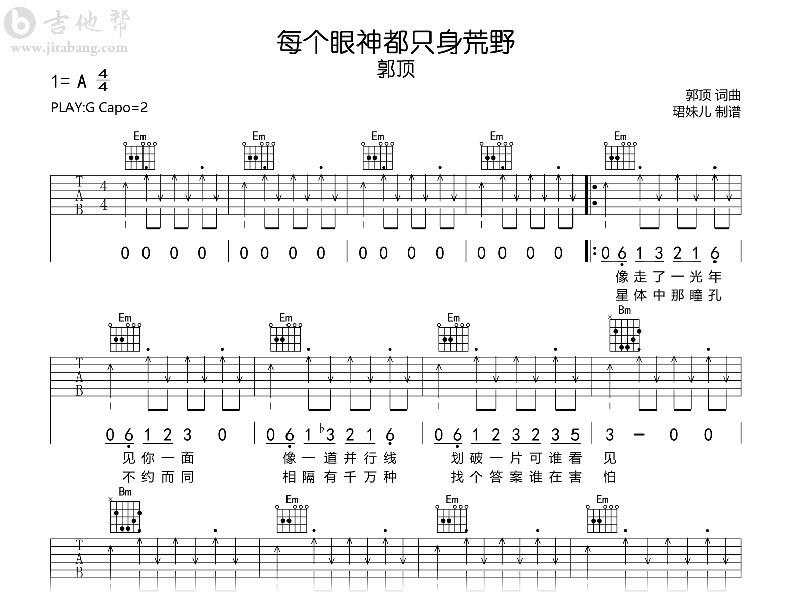 曲谱介绍: 每个眼神都只身荒野吉他谱,郭顶词曲创作演唱的一首歌曲,《每个眼神都只身荒野》吉他六线谱,原调A,采用G调指法编配,建议变调夹2品,速度85BPM难度较简单,演奏易上手。