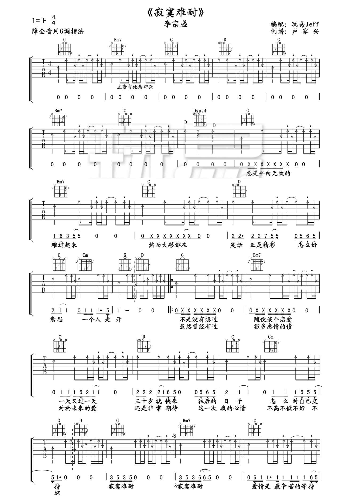 曲谱介绍: 寂寞难耐收录于李宗盛早期的《生命中的精灵》专辑,歌曲采用木吉他的伴奏,乐风朴实,没有过多华丽的编曲,加上李宗盛口白式的唱腔和特别真实的嗓音,唱出小人物的人生无奈和困惑迷茫,引起听众的共鸣。原调F降全音用G调指法。