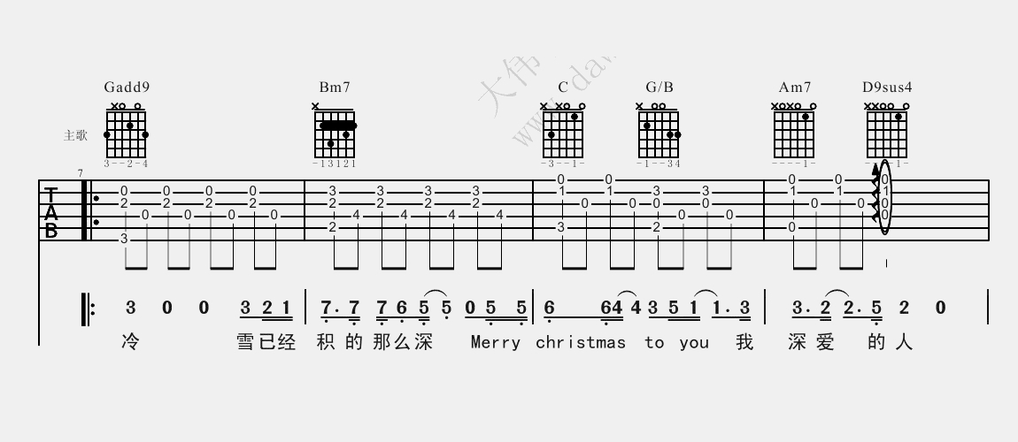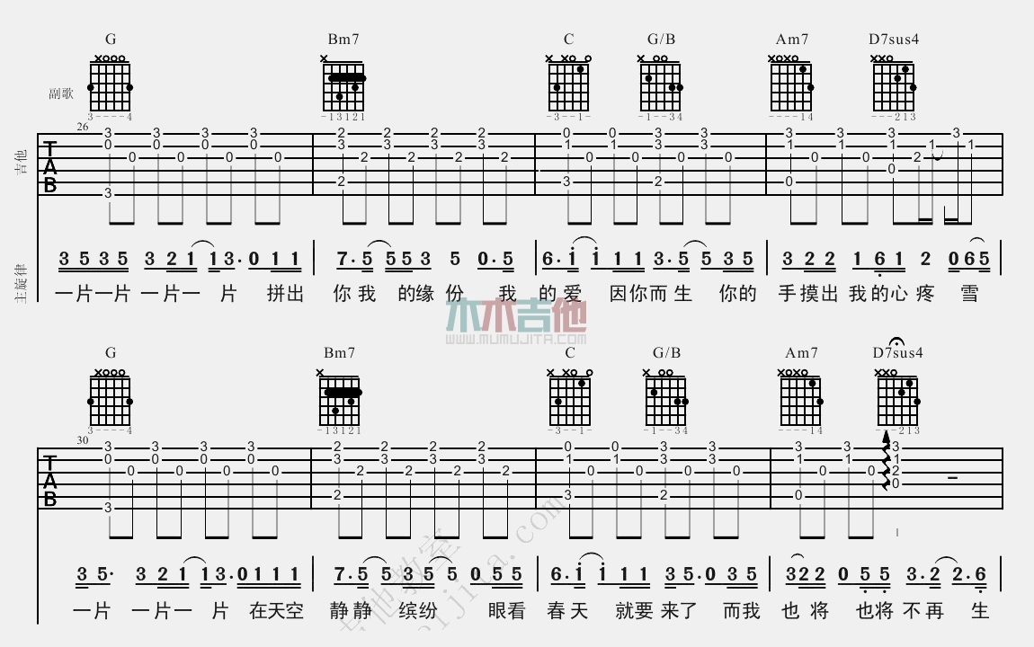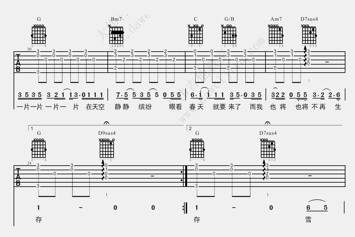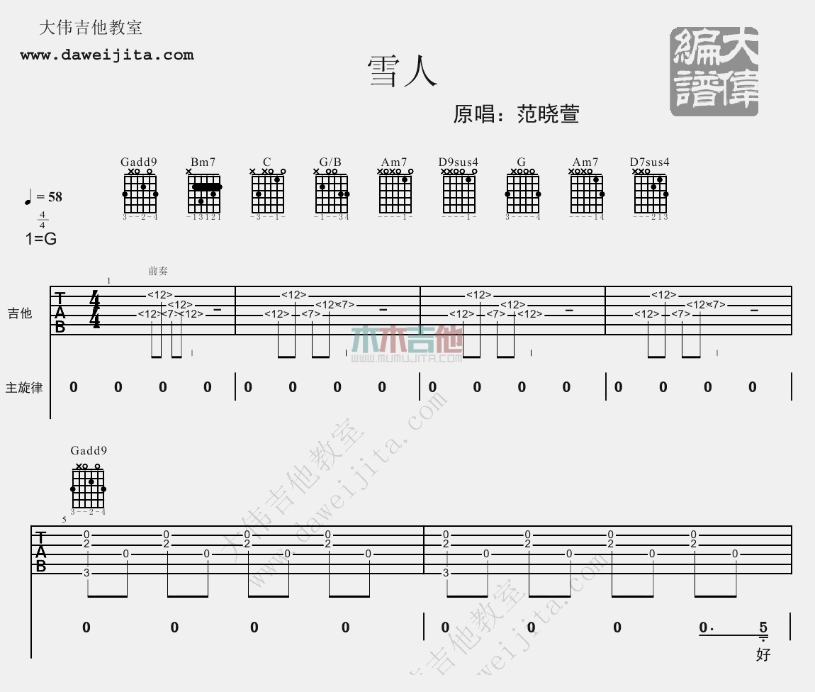 曲谱介绍: 范晓萱《雪人》吉他弹唱谱,采用G调指法编配,共有6张高清图谱。