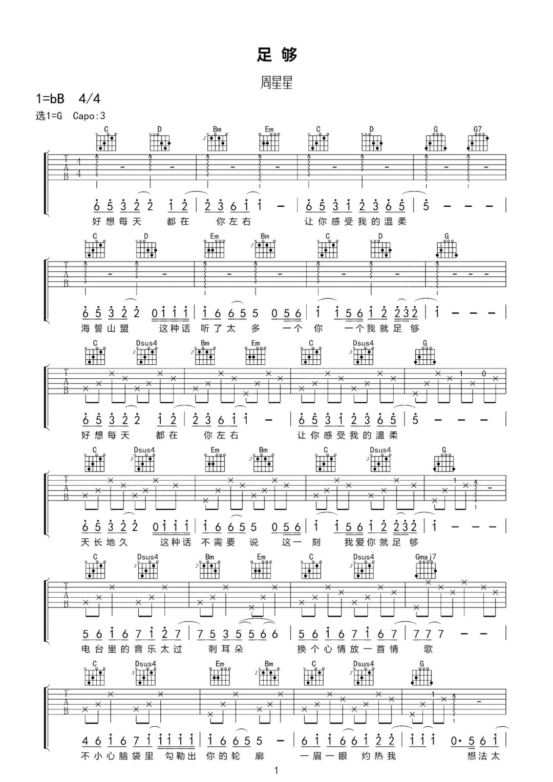 足够吉他谱 - 周星星 - G调吉他弹唱谱 - 原版
