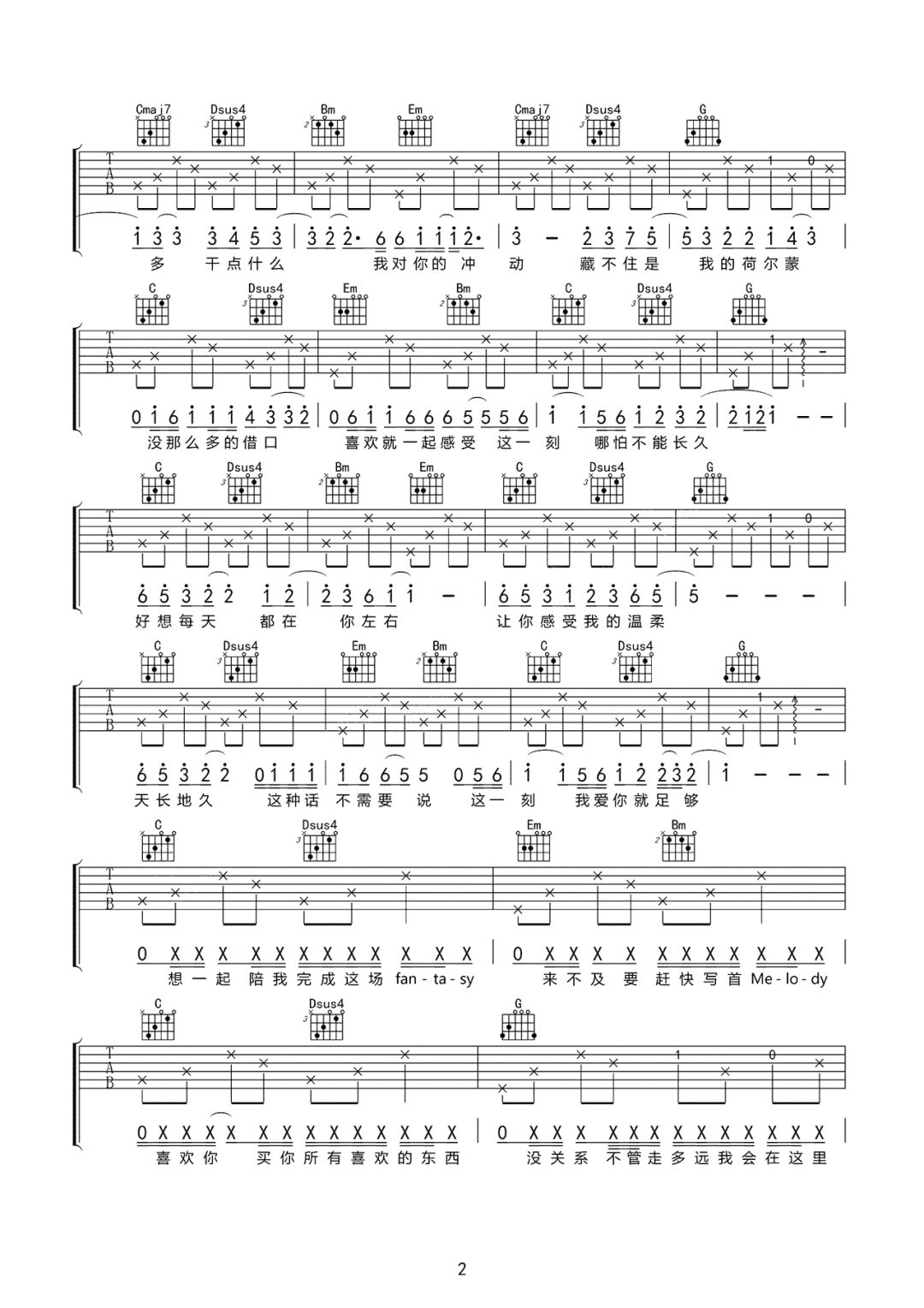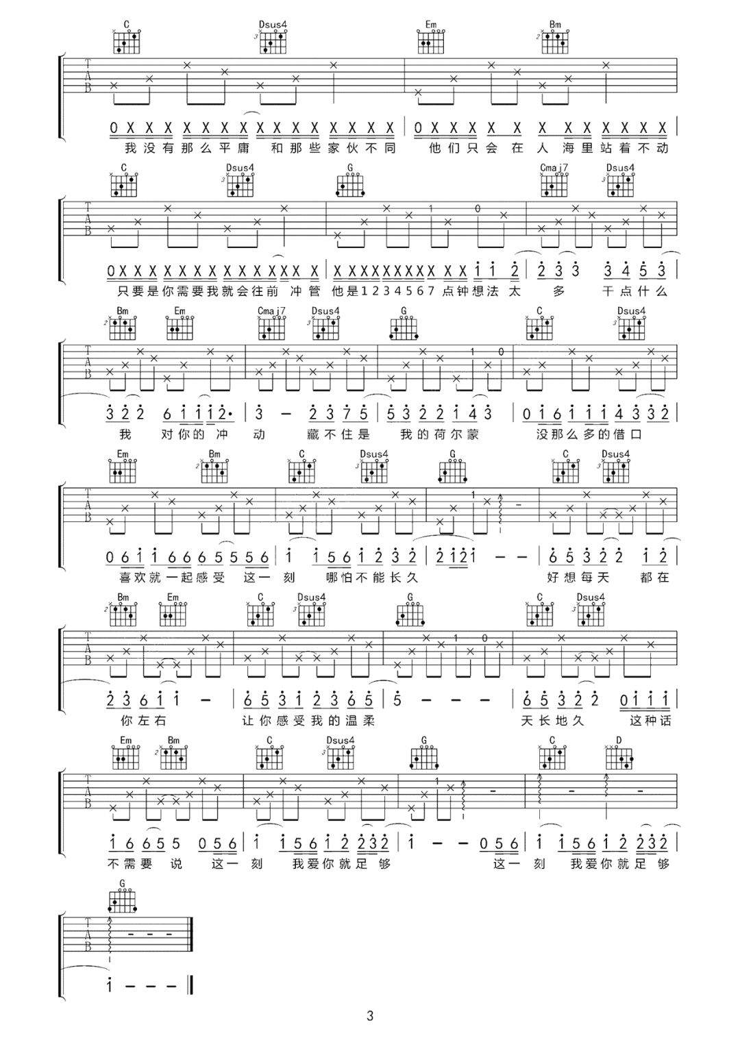 曲谱介绍: 吉他谱介绍:足够吉他谱,周星星演唱的一首歌曲,4/4拍的节奏,这首歌曲的原调为降B调,这里曲谱采用了G调指法进行编配,演唱时夹变调夹3品可回到原调,也可根据个人实际嗓音情况选择。曲谱由琴谱网更新上传,共3张高清图片弹唱吉他谱例,曲谱来源于网络转载,编配制谱者暂不详。一首非常适合在情人节听的歌,“好想每天都在你左右”,像是唱出了每对情侣的心声,真的很甜。歌曲唱的是一个人喜欢另一个人的心情,大概爱情就是这么的甜吧。