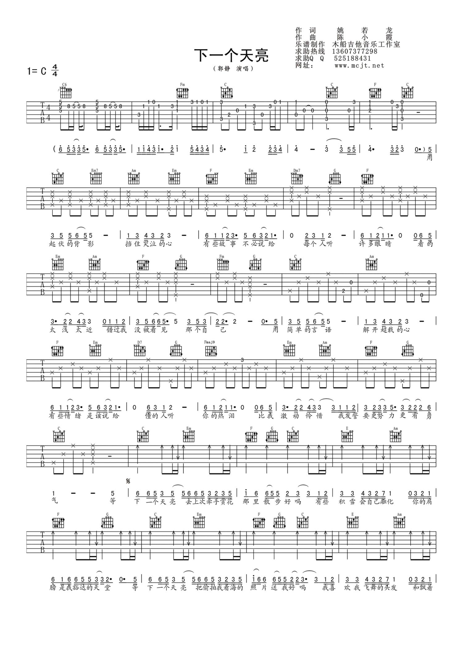 曲谱介绍: 下一个天亮吉他谱,C调弹唱谱,郭静演唱的一首好听的纯爱情歌,下一个天亮六线谱,两张图片谱高清版。陈小霞作曲;姚若龙填词,温暖明亮,纯净的歌声唱出你最内心的柔软。