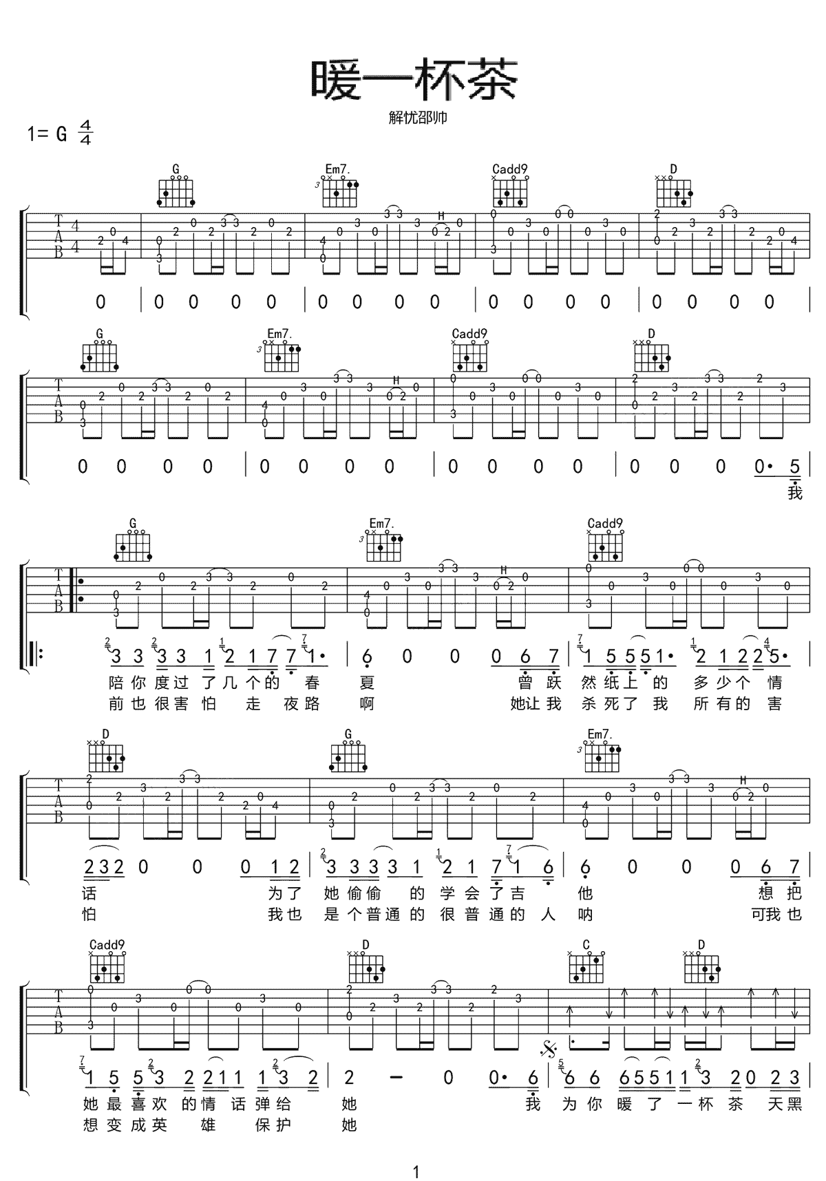 暖一杯茶吉他谱 - 解忧邵帅 - G调吉他弹唱谱 - 原版