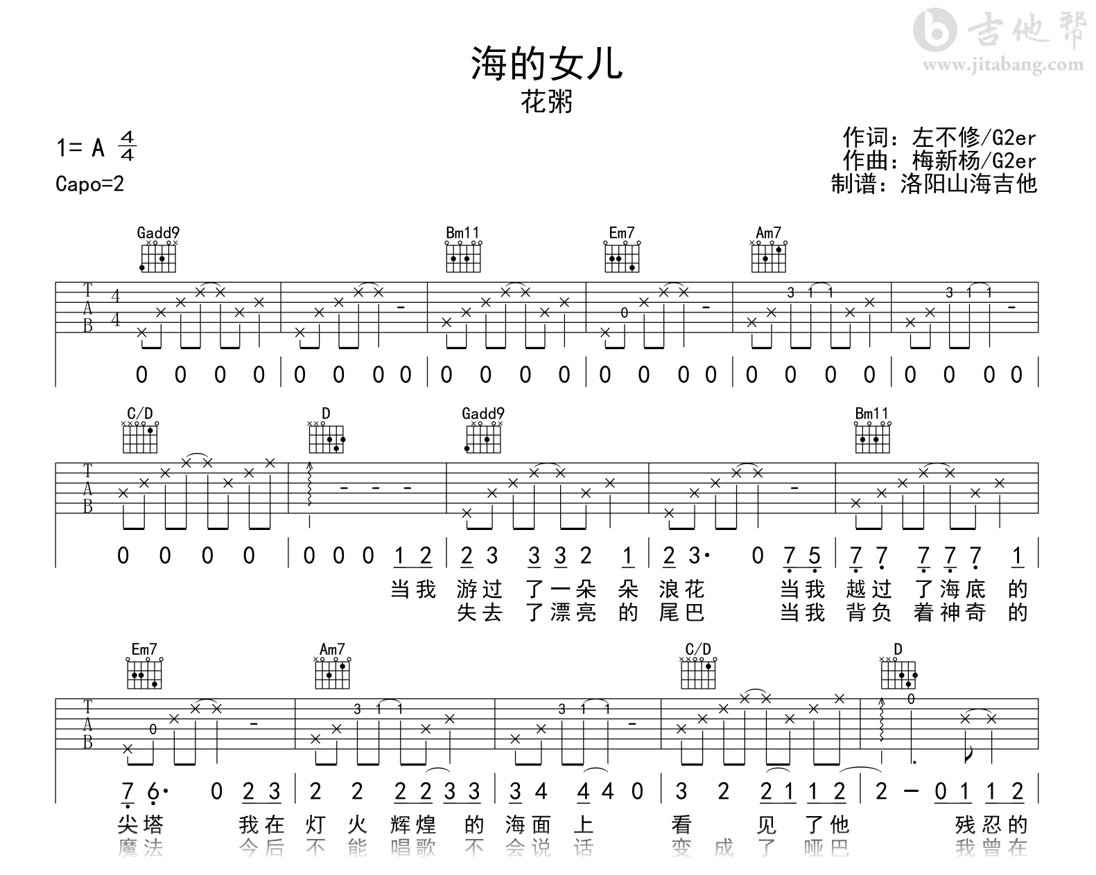曲谱介绍: 海的女儿吉他谱,花粥演唱,为爱放弃自由的人,将一生困于初见。《海的女儿》吉他弹唱谱,原调A,变调夹Capo2品,选用G调和弦指法编配,完整六线谱共两张高清图片谱例。