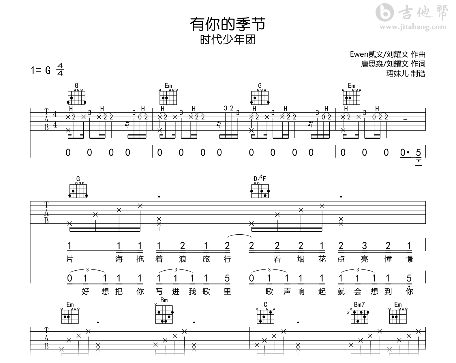 曲谱介绍: 有你的季节吉他谱,时代少年团演唱,《有你的季节》吉他弹唱谱,采用G调指法编配,原调不用变调夹,速度85BPM,演奏难度较简单易上手。
