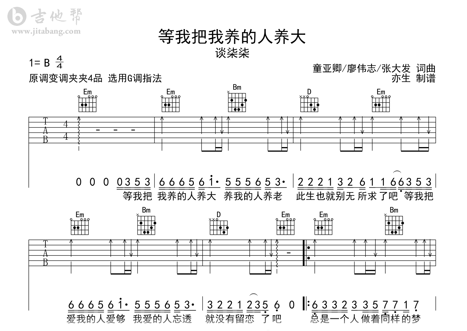 曲谱介绍: 等我把我养的人养大吉他谱,谈柒柒演唱,《等我把我养的人养大》吉他弹唱谱,原调B,采用G调和弦编配,建议变调夹夹第4品,节奏4/4拍,速度大概95拍每分钟,演奏难度简单。