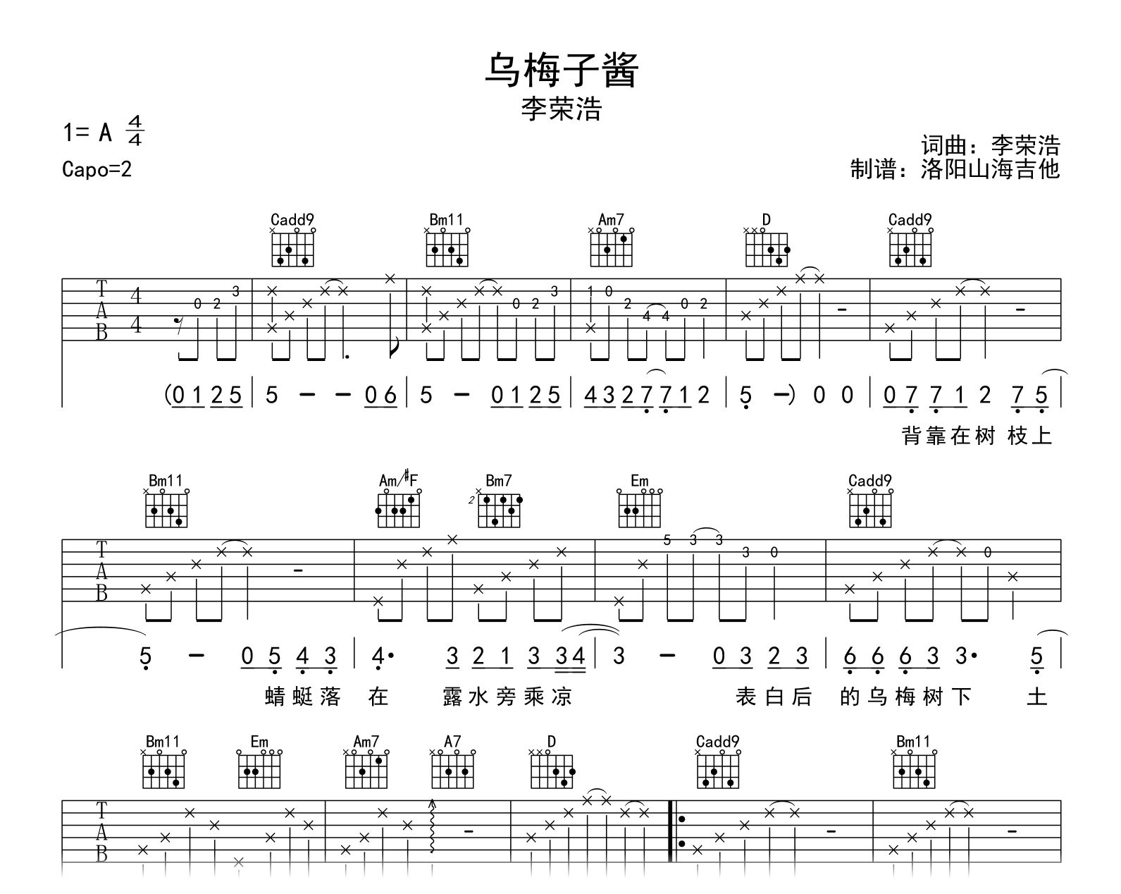 曲谱介绍: 乌梅子酱吉他谱,李荣浩新歌,一扫之前苦情歌的阴霾,这种甜甜的小情歌是否你的最爱?简单几句就勾勒出一幅幅你侬我侬的恋爱甜蜜场景,让我们一起品尝乌梅子酱味的爱情吧。 《乌梅子酱》吉他六线谱,原调为A调,选用G调指法编配,变调夹capo2品,完整高清图片谱共两张。