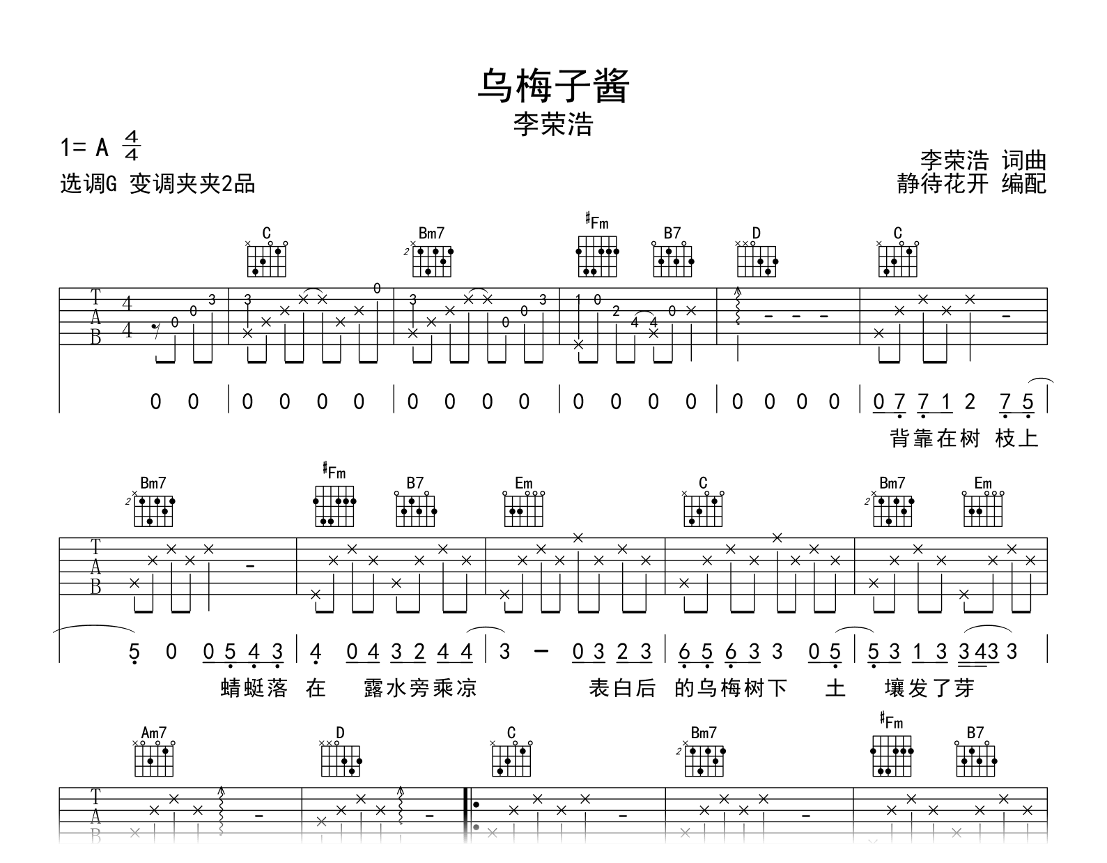 乌梅子酱吉他谱 - 李荣浩 - G调吉他弹唱谱