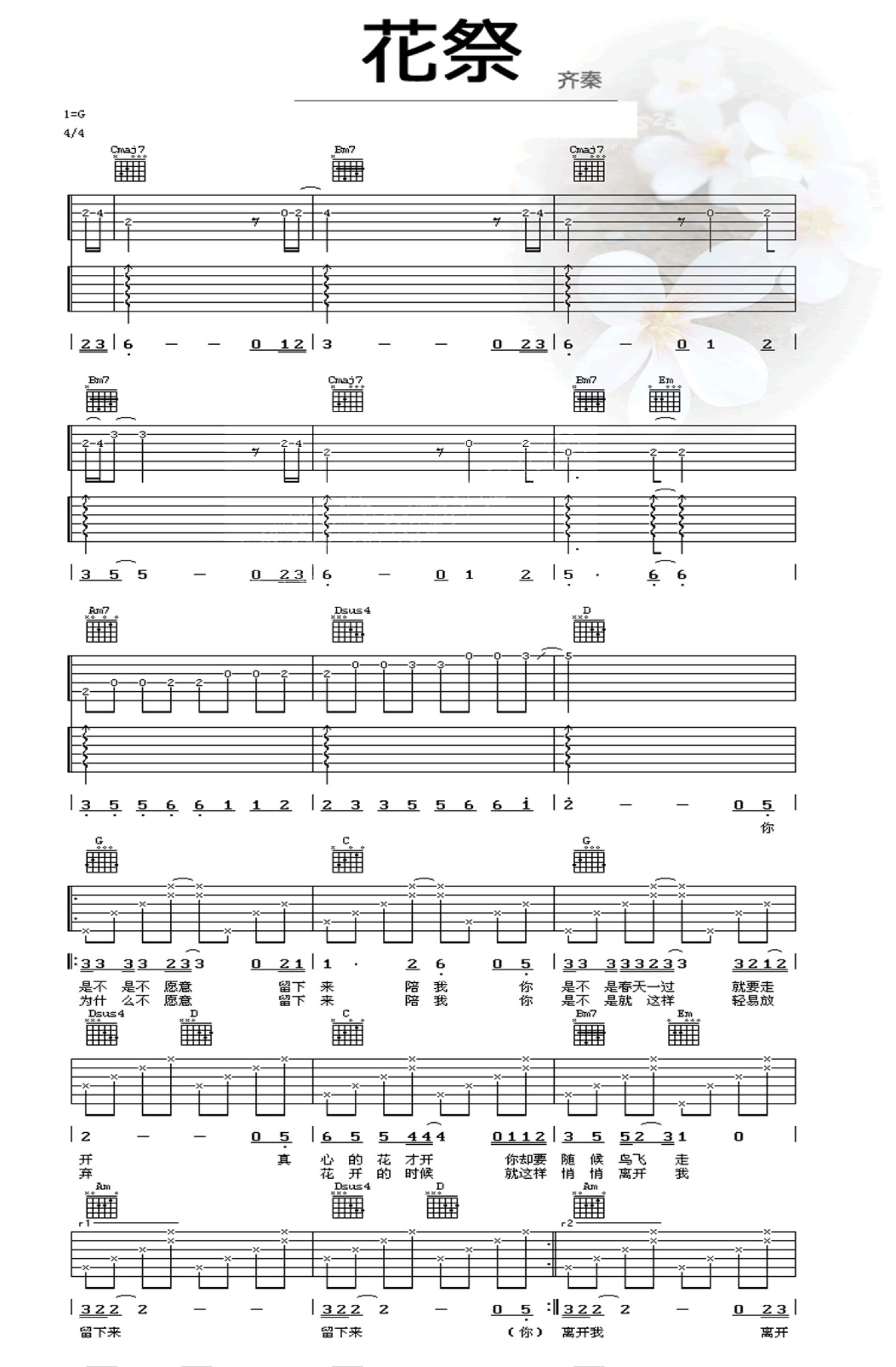 曲谱介绍: 齐秦-花祭吉他谱  齐秦的经典情歌,扫弦节奏型进行吉他弹唱。青春恰是一场花祭,花开的时候,是短暂的成全,花落的时刻,也是永恒的祭奠。听一首歌,祭奠我们爱情终结,祭奠逝去的青葱岁月。