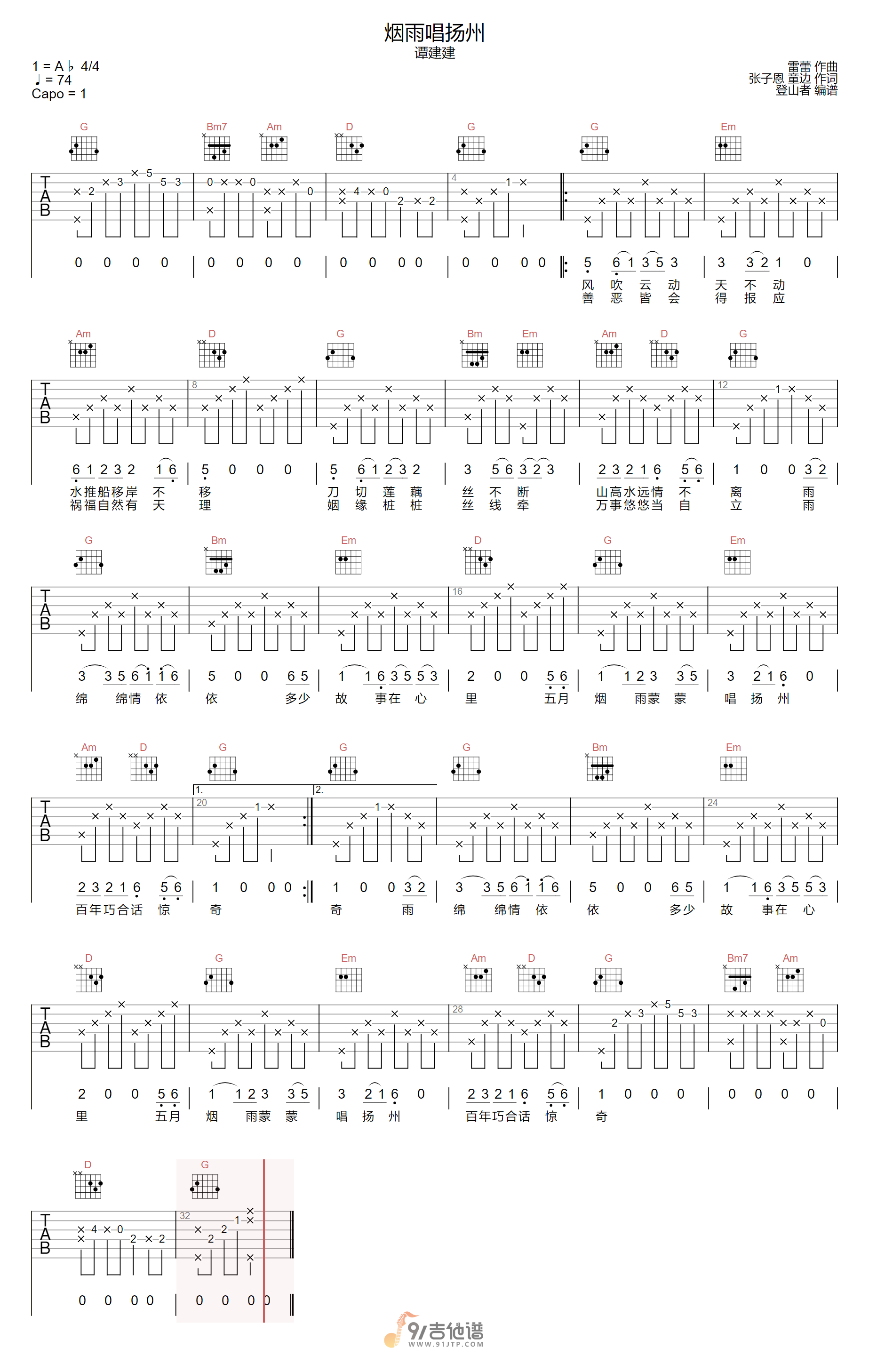 曲谱介绍: 曲谱简介:烟雨唱扬州吉他谱,谭建建演唱的一首歌曲,4/4拍的节奏,这首歌曲的原调为降A调,这里曲谱采用了G调指法进行编配,演唱时夹变调夹1品可回到原调,也可根据个人实际嗓音情况选择。曲谱由登山者编配出品。