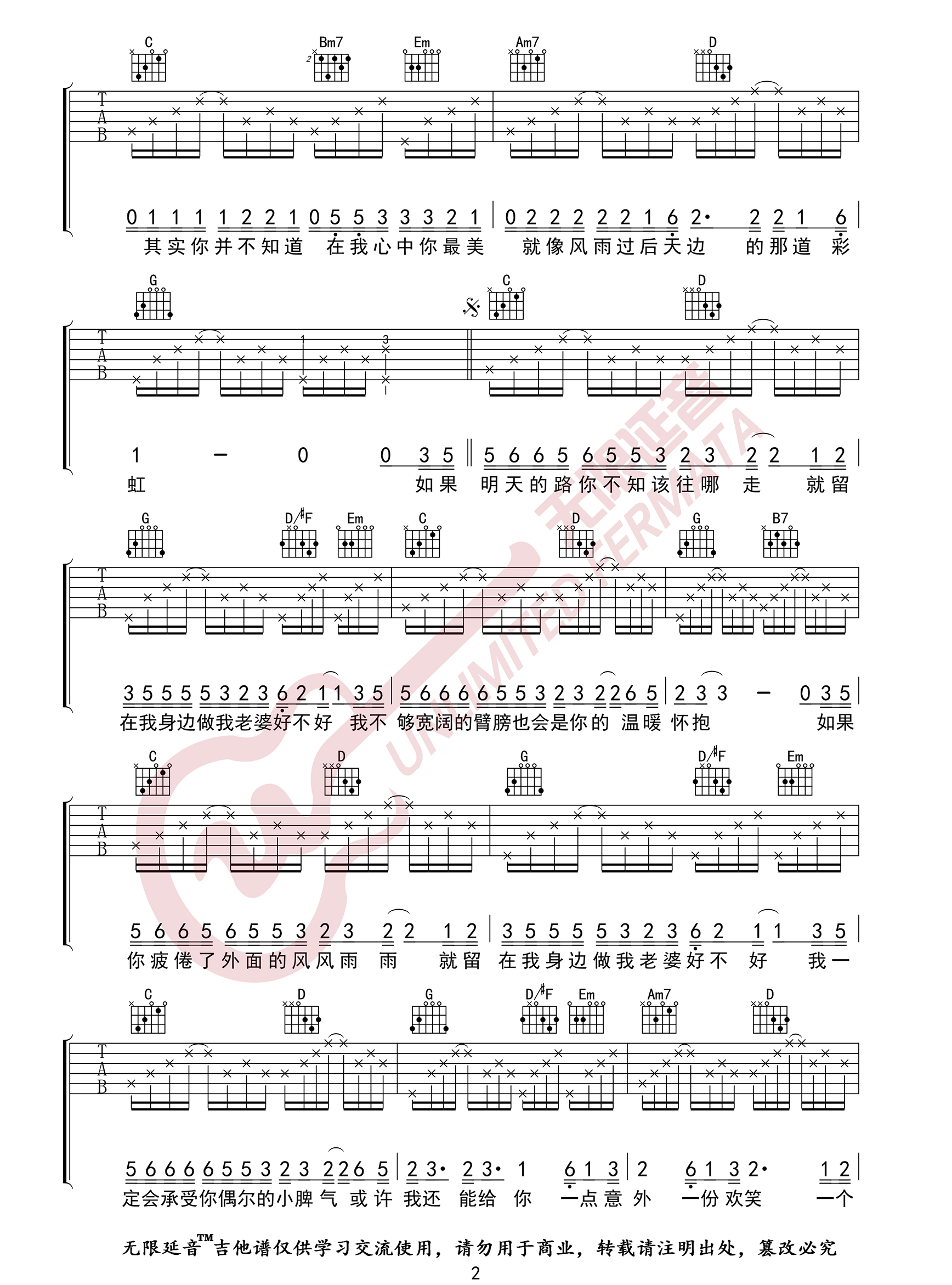 曲谱介绍: 吉他谱介绍:做我老婆好不好吉他谱,徐誉滕演唱的一首歌曲,4/4拍的节奏,这首歌曲的原调为G调,这里曲谱采用了G调指法进行编配,演唱时可不夹变调夹,曲谱由琴谱网更新上传,共3张高清图片弹唱吉他谱例,来源于@无限延音编配出品。如果你疲倦了外面的风风雨雨,就留在我身边做我老婆好不好,我一定会承受你偶尔的小脾气,或许我还能给你一点意外,一份欢笑一个简单安心的小窝。