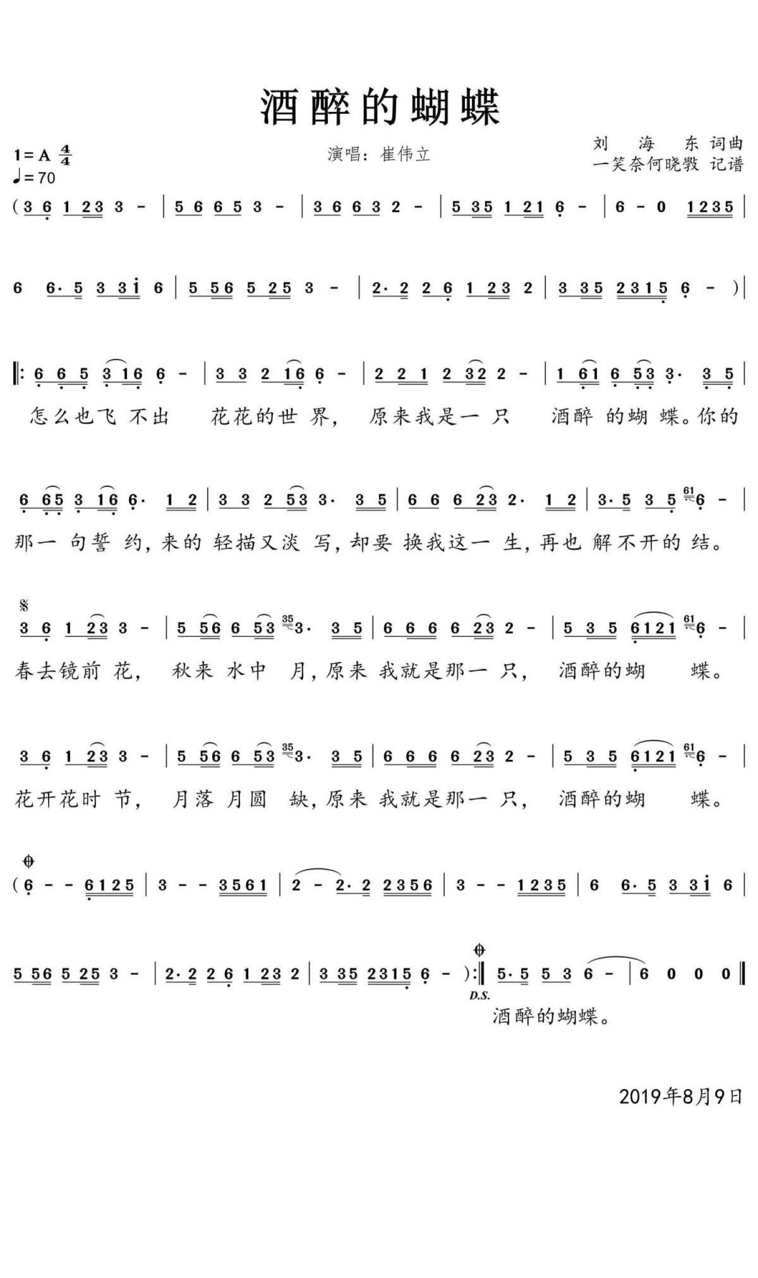 酒醉的蝴蝶简谱 - 崔伟立