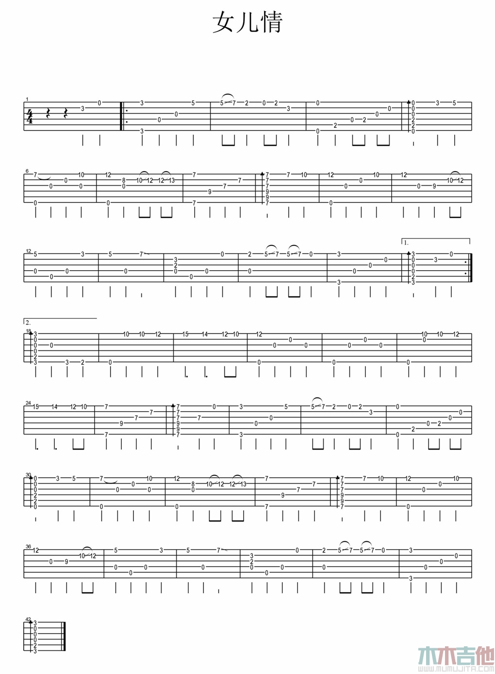 女儿情吉他谱 - 吴静 - 吉他独奏谱