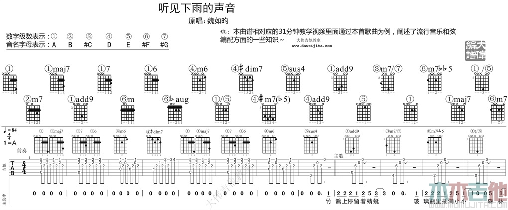 曲谱介绍: 关诗敏《听见下雨的声音》吉他弹唱谱,采用A调指法编配,共有3张高清图谱。
