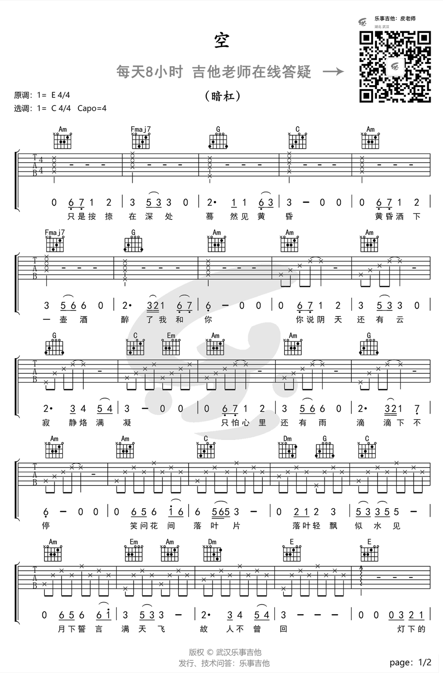 曲谱介绍: 《空》吉他谱,暗杠的一首关于爱和想念的原创歌曲,原调E,选调C调,Capo夹二品,有多少感情辛苦了多少年到头来却是一场空。人的心就像一个泥潭,本来也没什么东西,但你也不觉得它空,可一旦有个人在泥潭里走过,留下一串脚印,你就总会觉得哪哪空了一块。花前月下,如果不想起他的誓言,也就不会觉得少了故人。湖边美景,如果不念着有他相伴,也就不会觉得心里空空荡荡了。