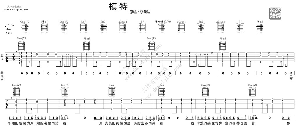 曲谱介绍: 李荣浩《模特》吉他弹唱谱,采用D调指法编配,共有5张高清图谱。