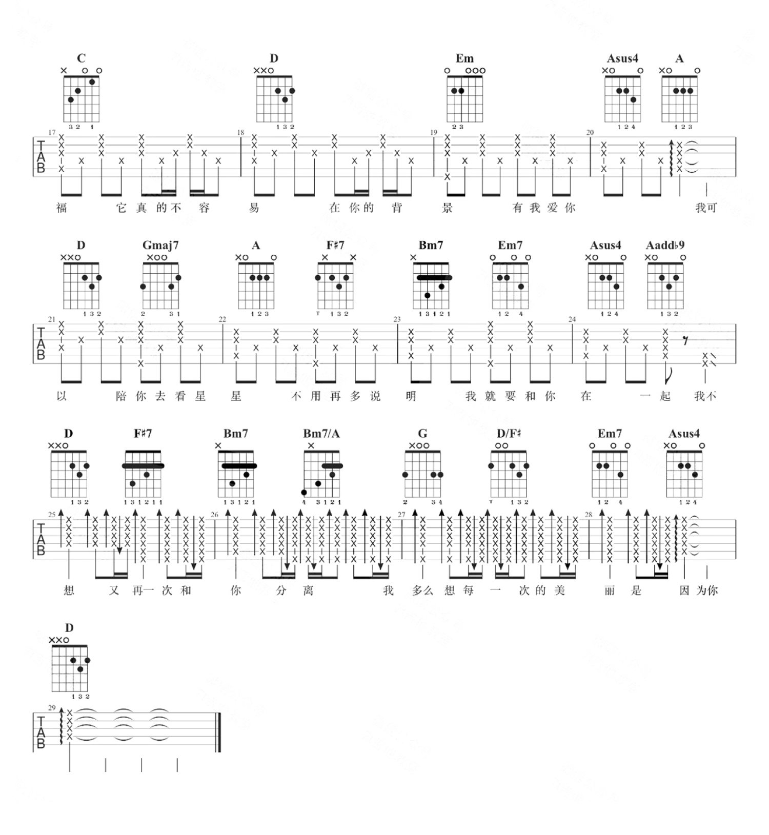 曲谱介绍: 蔡F佑《我可以》吉他谱,台湾偶像剧《转角遇到爱》插曲。我可以陪你去看星星,不用再多说明,我只想跟你在一起,一首浪漫告白歌曲。这首歌的原调是G#大调,用了D大调的指法来编配,视频里是标准音调弦,夹了第1品,适合音域较低的男生或音域较高的女生。想唱原调的琴友们可以标准音调弦,并且使用变调夹,夹在第6品哦!