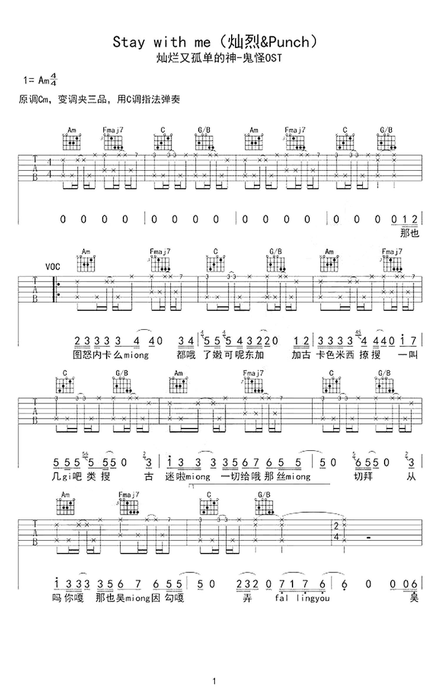 曲谱介绍: 《Staywithme》吉他谱,朴灿烈和Punch演唱的一首歌曲,韩国爱情奇幻连续剧《孤单又灿烂的神-鬼怪》的首支OST,选用C调,有没有因为这首超级好听的歌曲去追这部电视剧的?灿烈低沉温柔的嗓音与Punch细腻的女声完美融合,配合的十分完美。给这部电视剧也算是锦上添花上了。
