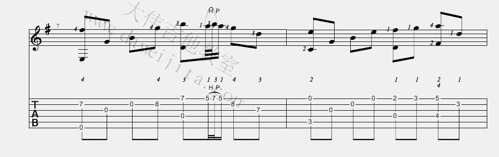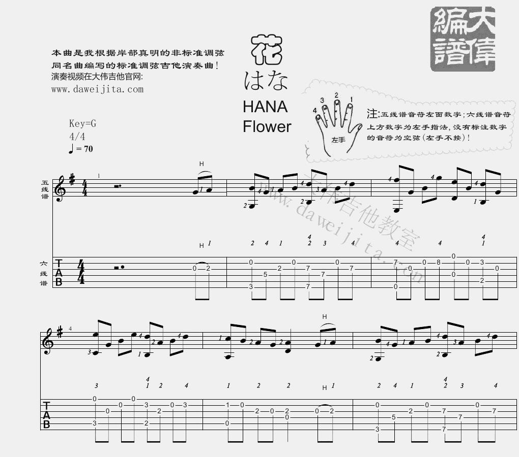 曲谱介绍: 岸部真明《花Flower》吉他独奏谱,采用G调指法编配,共有9张高清图谱。