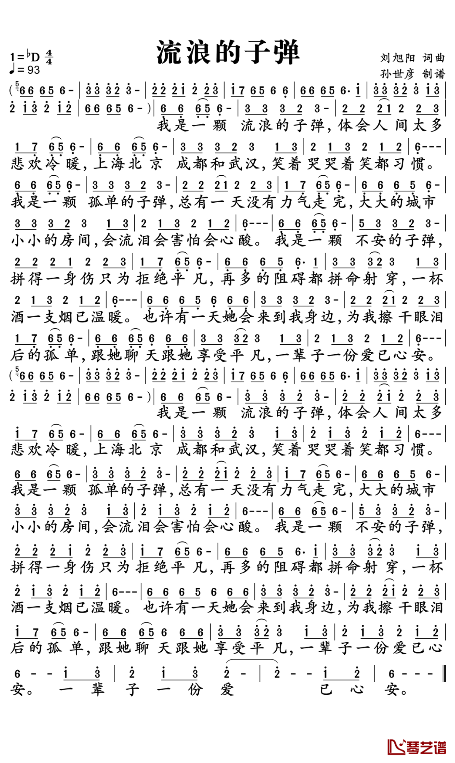 曲谱介绍:  我是一颗流浪的子弹 体会人间太多悲欢冷暖 上海北京成都和武汉 笑着哭哭着笑都习惯 我是一颗孤单的子弹 总有一天没有力气走完 大大的城市小小的房间 会流泪会害怕会心酸 我是一颗不安的子弹 拼得一身伤只为拒绝平凡 再多的阻碍都拼命射穿 一杯酒一支烟已温暖 也许有一天她会来到我身边 为我擦干眼泪后的孤单 跟她聊天跟她享受平凡 一辈子一份爱已心安 我是一颗流浪的子弹 体会人间太多悲欢冷暖 上海北京成都和武汉 笑着哭哭着笑都习惯 我是一颗孤单的子弹 总有一天没有力气走完 大大的城市小小的房间 会流泪会害怕会心酸 我是一颗不安的子弹 拼得一身伤只为拒绝平凡 再多的阻碍都拼命射穿 一杯酒一支烟已温暖 也许有一天她会来到我身边 为我擦干眼泪后的孤单 跟她聊天跟她享受平凡 一辈子一份爱已心安 一辈子一份爱已心安   《流浪的子弹》是内地唱作人刘旭阳演唱的歌曲。它唱出了多少在外拼搏漂泊的人们内心的苦楚和心酸。陌生的城市,一个人流浪,这里有交不完的房租,熬不完的夜,看不透的人心,听不完的谎言,还有经历不完的心酸苦辣……  有打拼的地方没有家,有家的地方却没有前方,他乡容不下灵魂,家长容不下梦想,一个叫家的地方却找不到出人头地的路,找到出人头地的路却安不了家,从此便有了远行,有了乡愁,有了无尽的牵挂!  没有见过凌晨四点半的街道,没有见过车水马龙的高楼之上颓丧的人,没有见过满是疤痕的手臂,没有见过冷清的街头只知道低头走路的人,没有见过爷茶里疲惫的眼睛,眼泪都干涸了,手里却还固执的夹着香烟的人。  一生辗转千万里,莫问成败重几许,得之坦然,失之淡然,与其在别人的辉煌里仰望,不如亲手点亮自己的心灯,扬帆远航,把握最真实的自己,才会更深刻地解读自己……