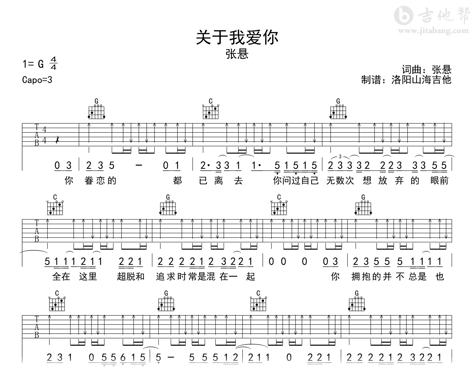 关于我爱你吉他谱 - 张悬 - G调吉他弹唱谱