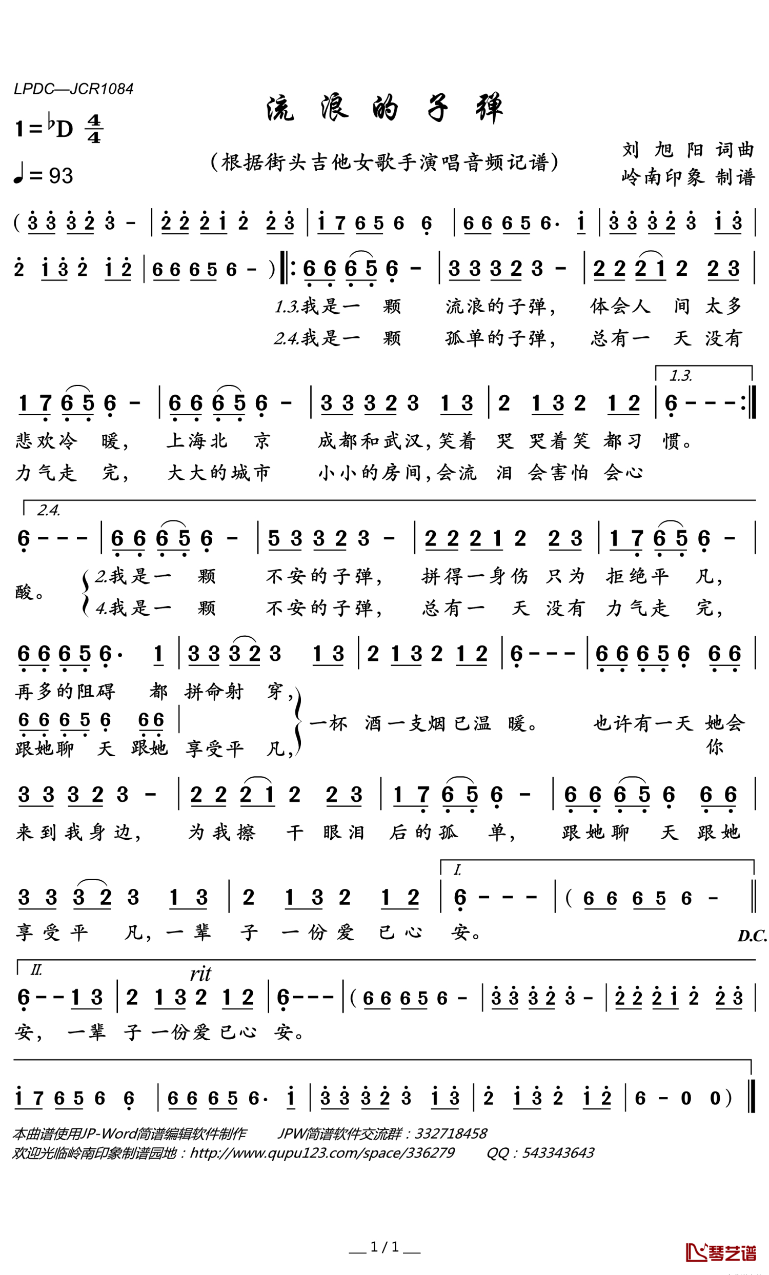 曲谱介绍: 《流浪的子弹》歌词 刘旭阳词曲街头吉他女歌手演唱Music…1.我是一颗流浪的子弹,体会人间太多悲欢冷暖,上海北京成都和武汉,笑着哭哭着笑都习惯。2.我是一颗孤单的子弹,总有一天没有力气走完,大大的城市小小的房间,会流泪会害怕会心酸。我是一颗不安的子弹,拼得一身伤只为拒绝平凡,再多的阻碍都拼命射穿,一杯酒一支烟已温暖。也许有一天她会来到我身边,为我擦干眼泪后的孤单,跟她聊天跟她享受平凡,一辈子一份爱已心安。Music…3.我是一颗流浪的子弹,体会人间太多悲欢冷暖,上海北京成都和武汉,笑着哭哭着笑都习惯。4.我是一颗孤单的子弹,总有一天没有力气走完,大大的城市小小的房间,会流泪会害怕会心酸。我是一颗不安的子弹,总有一天没有力气走完,跟她聊天跟她享受平凡,一杯酒一支烟已温暖。也许有一天你会来到我身边,为我擦干眼泪后的孤单,跟她聊天跟她享受平凡,一辈子一份爱已心安,一辈子一份爱已心安。Music…