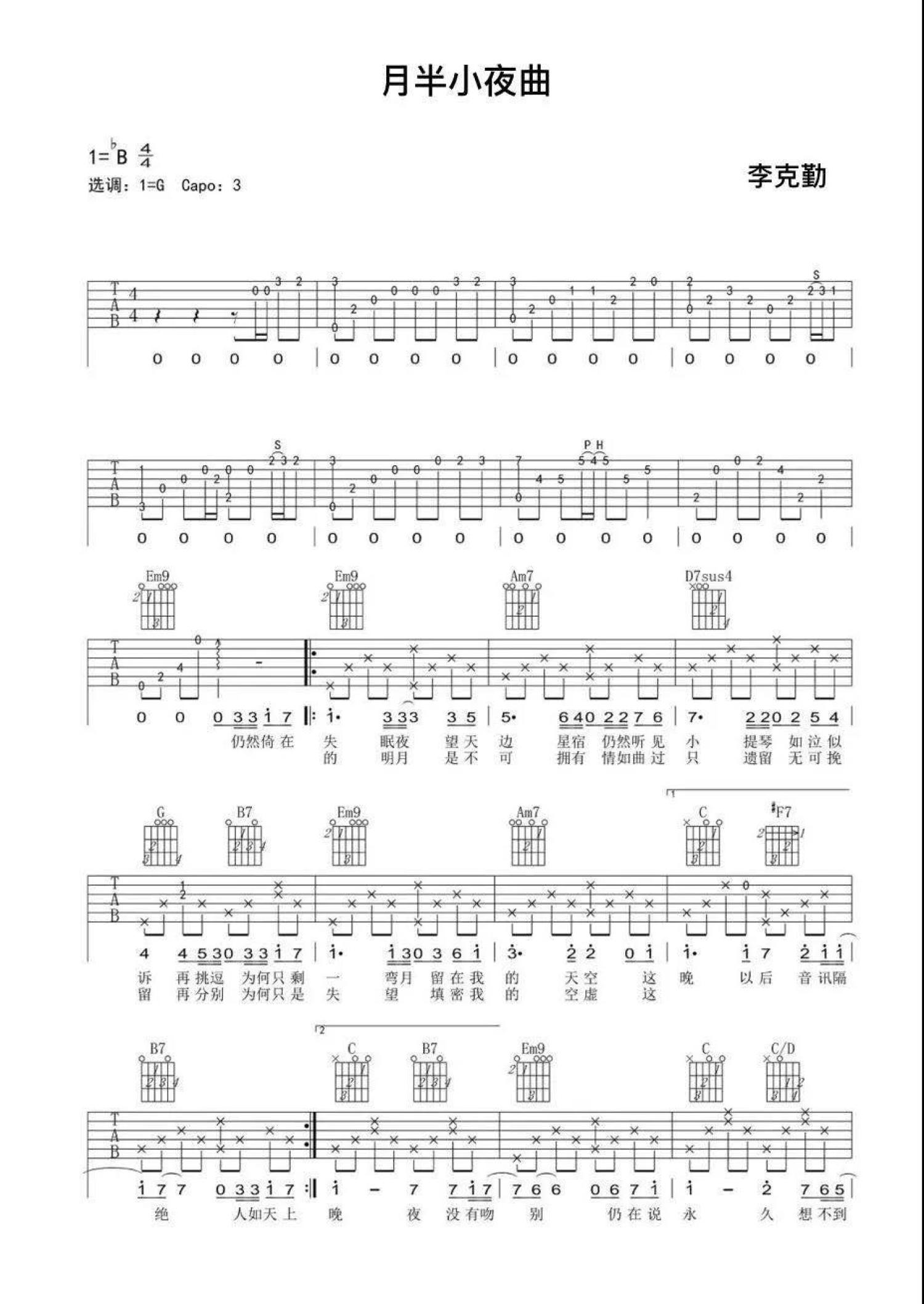 曲谱介绍: 李克勤《月半小夜曲》吉他谱_G调吉他弹唱谱