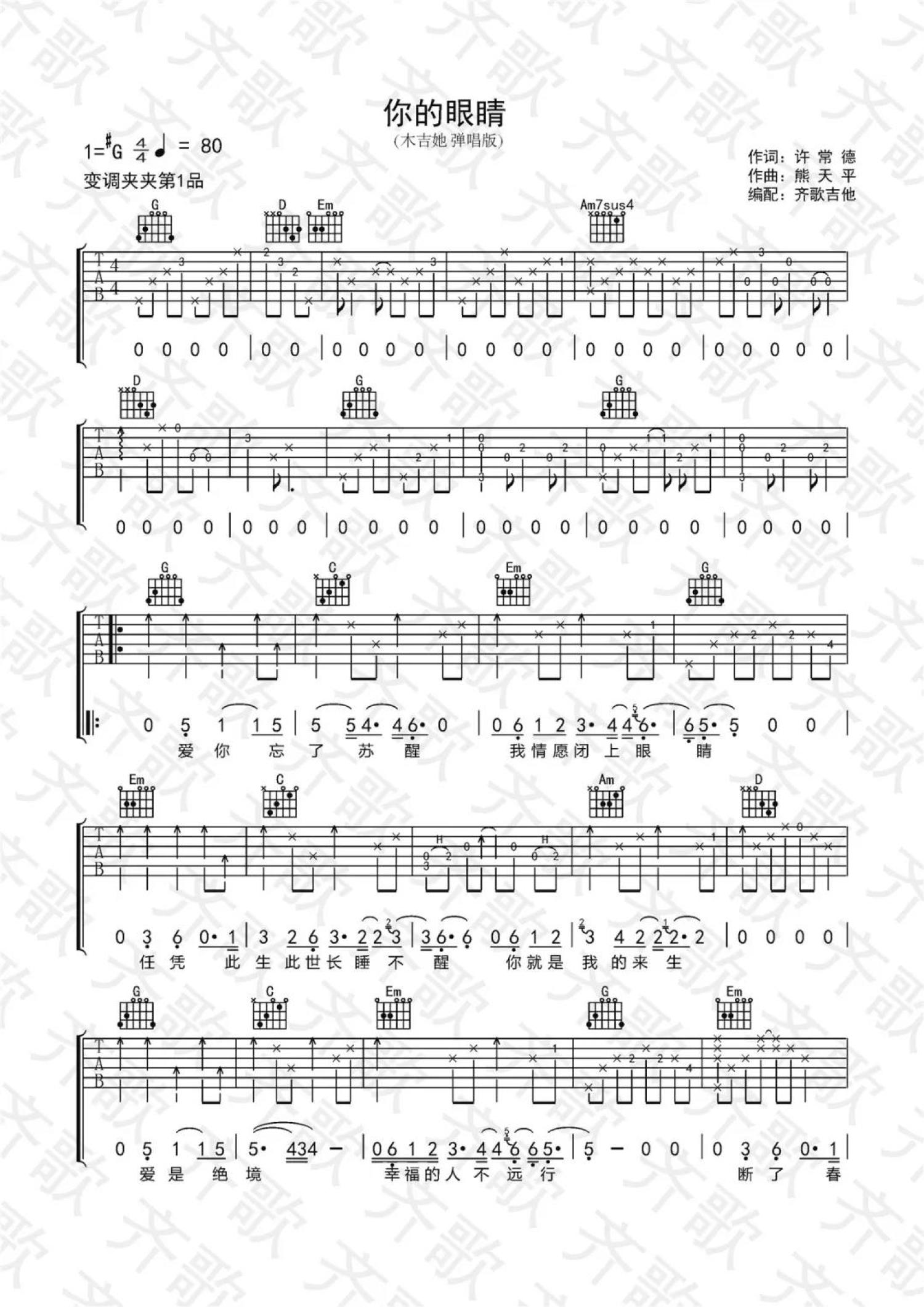 曲谱介绍: 熊天平和许茹芸《你的眼睛》吉他谱_G调吉他弹唱谱