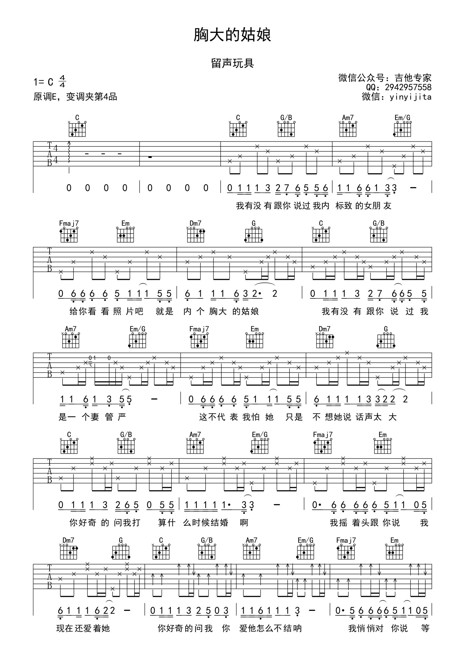 • 胸大的姑娘吉他谱 - 留声玩具 - C调吉他弹唱谱第1张