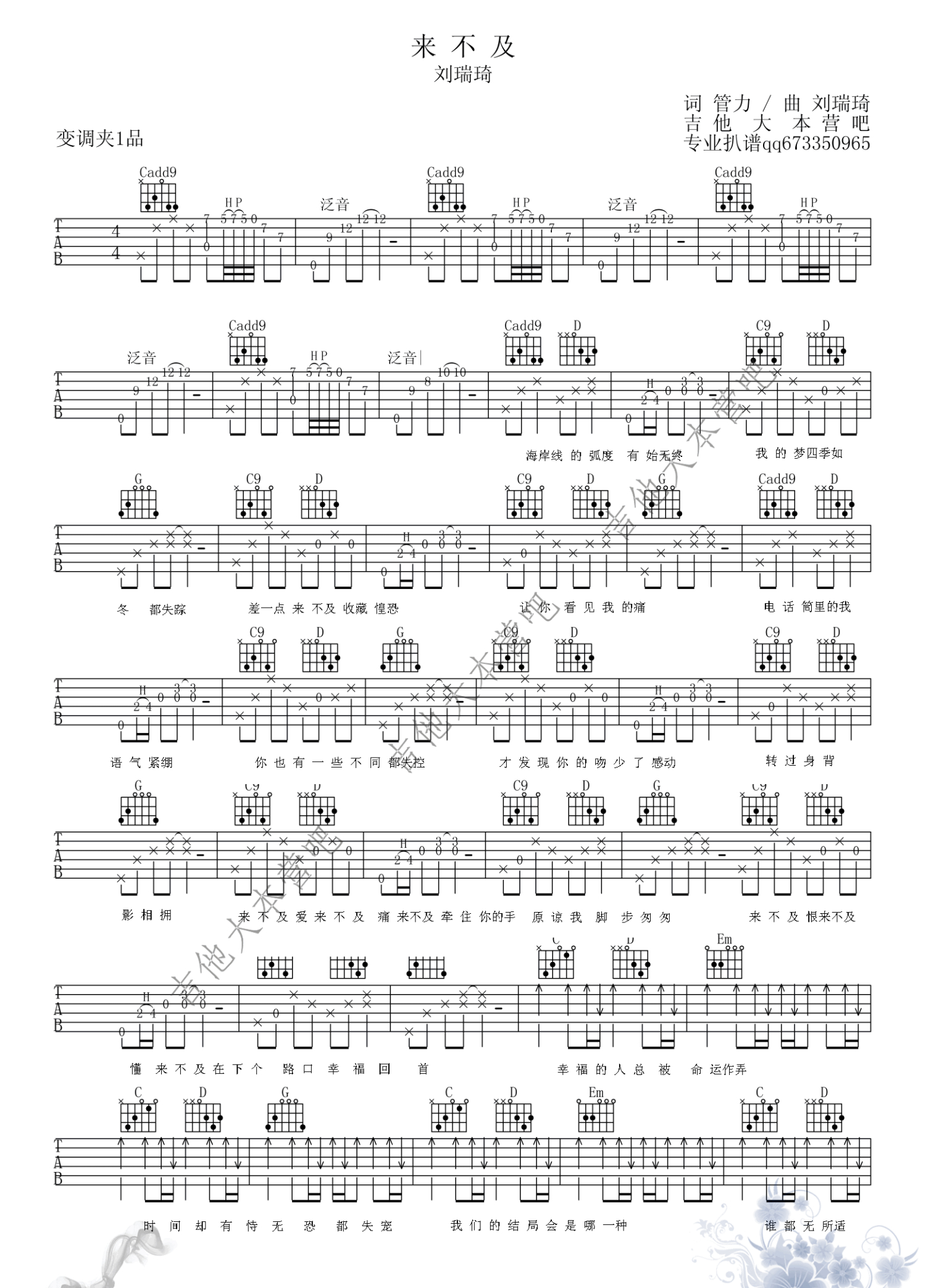 曲谱介绍: 刘瑞琦《来不及》吉他谱,变调夹夹一品。来不及吉他弹唱谱,歌曲收录在刘瑞琦《青春留言》专辑。歌曲表达的不是那种死去活来的爱情,没有大起大落。它的开头有点安静,淡淡的诉说自己的感伤,像梦一样虚无缥缈却又是很真实,有些心酸,有些低落,有那么点心酸是无法言语的,来不及爱,来不及恨,来不及痛,对爱情的无助失望体现的淋漓尽致。很多时候没有什么来不来得及,只有你愿不愿意坚持。