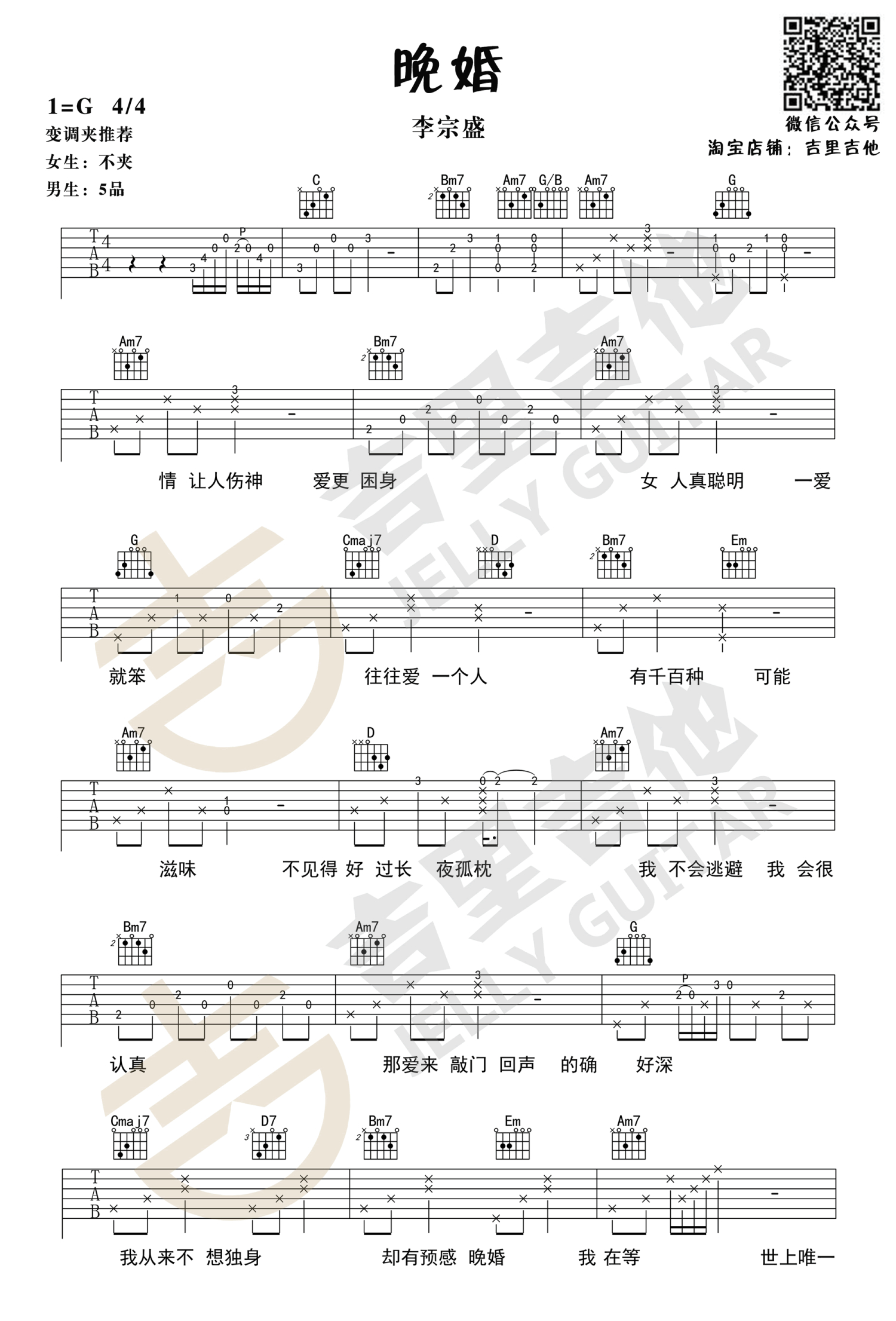 曲谱介绍: 晚婚吉他谱,李宗盛演唱,G调指法,变调夹推荐,女生不夹,男生夹五品。谭维维在《梦想的声音》深情演唱了这首歌曲。一句“我从来不想独身,却有预感晚婚”,唱尽了多少人的心酸。人世沉浮来来往往,我们不停地遇见,又不停的错过;踏遍千山万水后,却依然渴望爱与被爱。为求灵魂相契的伴侣,即使是晚婚,又有什么可怕的呢?
