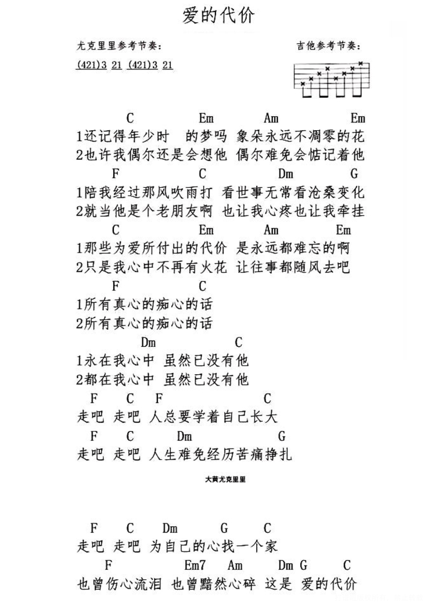 曲谱介绍: 原调bE,选调C,变调夹夹三品节奏见图片谱注释。一首李宗盛的爱的代价唱出了多少男人们对过去最美好的回忆的感慨,也唱出这些年都市人的沉沉浮浮,百转千回,这是历经岁月的洗礼才能懂得的成熟。
